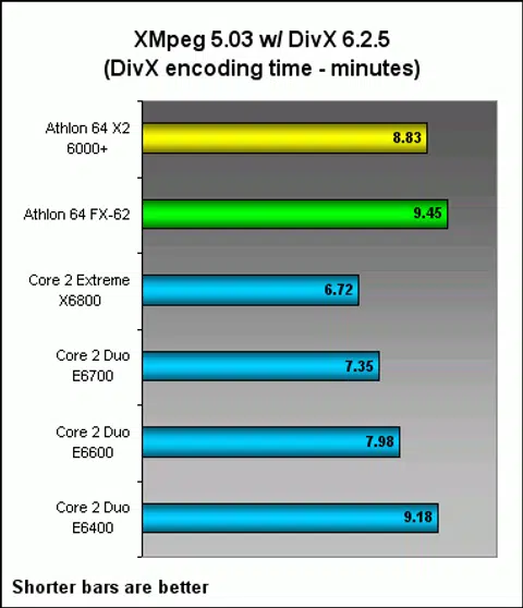 In our Xmpeg DivX encoding tests, we found the Athlon 64 X2 6000+ to be 7% speedier than the FX-62 part by shaving 42 seconds off the 1GB test file encoded. Unfortunately, this is still over 10% slower than even the Core 2 Duo E6600 which manages to complete nearly a minute faster than the newcomer from AMD.
