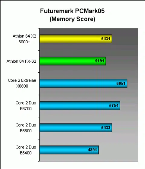 Here's another synthetic test suite in PCMark05, but this time, we measure subsystem performance based on a few quick test sets built into the benchmark. Unfortunately, the outcome is again somewhat similar to SYSmark 2004 where even the Core 2 Duo E6600 stands in better light. Surprisingly, the memory tests didn't really pickup any performance deficit from an under efficient memory subsystem.