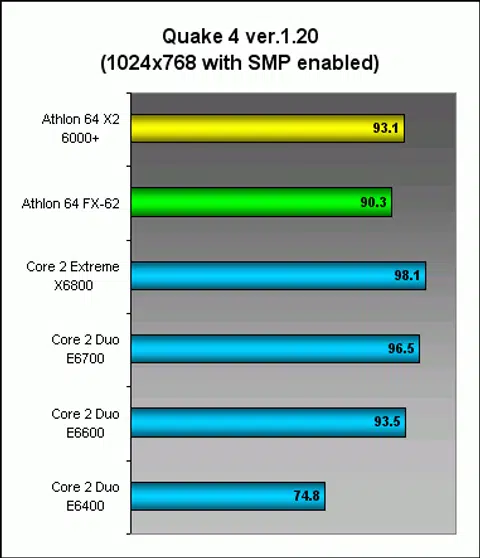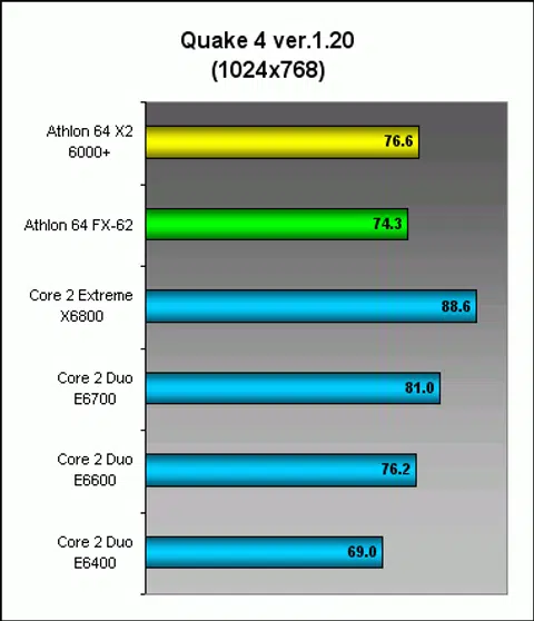In the popular Quake 4 benchmark, we see the Athlon 64 X2 6000+ on equal footing with the Core 2 Duo E6600 processor, but still falls short of the E6700's standard by a notable margin. While the Athon 64 X2 6000+ is plenty fast enough with a GeForce 7900 GT in this game (at this particular test settings), but so are all other processors in this comparison. The real question is which processor offers more performance to better outlast the rest of them when faced with the real crunch. Obviously, the higher the performance figures, the better, so the Core 2 Duo series still gets the nod here.