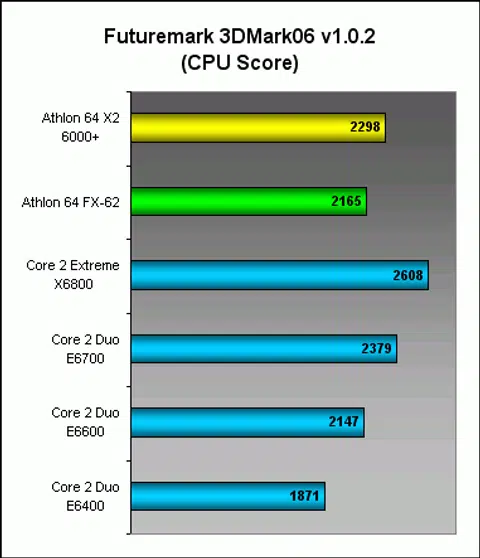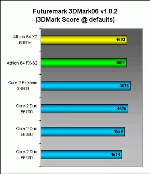 In 3DMark06's tests, the CPU is also actively involved in the normal graphics benchmarks for some physics and flight path calculation of the jet-packed airship rendered on screen, but when considering its influence in the big picture of a gaming performance indicator, graphics performance is still key. Thus you can see why the Athlon 64 X2 6000+ fared well in the overall 3DMark scores, but not so when considering the CPU tests only. While the GPU may have the last say today in pure gaming performance, this might not be the case considering games like Alan Wake in the near future; so don't write-off the influence of the CPU just yet.