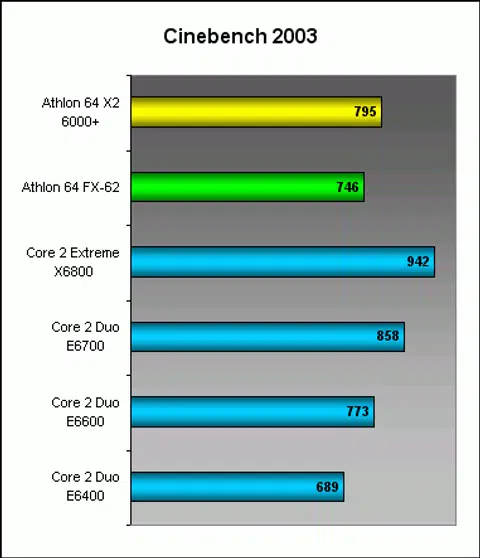 In Cinebench 2003's highly-threaded rendering benchmark, we once again saw similar performance standings where the Athlon 64 X2 6000+ leads its predecessor by around 6%, but still ends up slower than a Core 2 Duo E6700 processor.