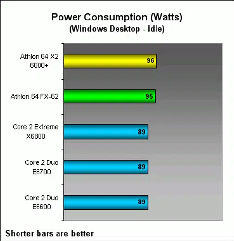 Take note that we've enabled all platform power saving options like Enhanced Intel Speedstep Technology (EIST) as well as Cool'n'Quiet (CnQ) Technology on AMD processors to simulate real world setup experience in this segment. On a side note, with or without EIST enabled, we saw only small differences to the net power consumption on Intel processors, but this was the exact opposite observation for AMD processors. Without CnQ, these high-speed AMD processors drew up to 30% more power (depending on the situation). So if you are an Athlon 64 user, make sure you have installed the CnQ driver (from AMD's website) for Windows XP operating system. Windows Vista users don't require any drivers, but for both operating systems, you should load the 'Minimal Power Management' profile in the control panel to enable this power savings technique to kick into effect. With that said, the following are our observations:-