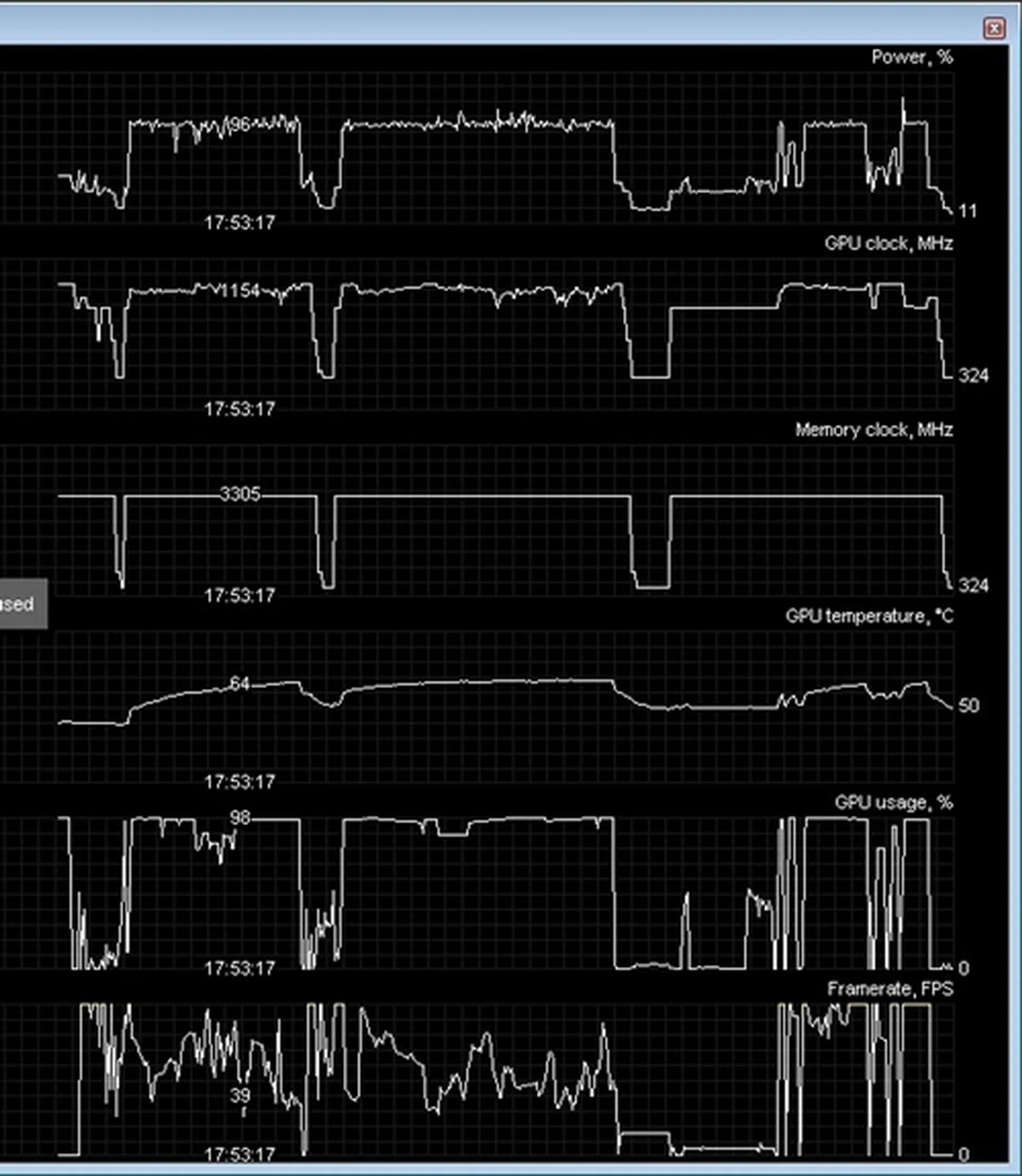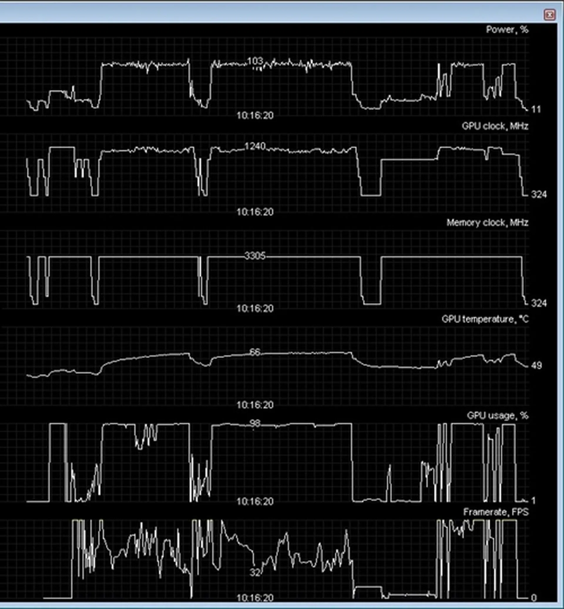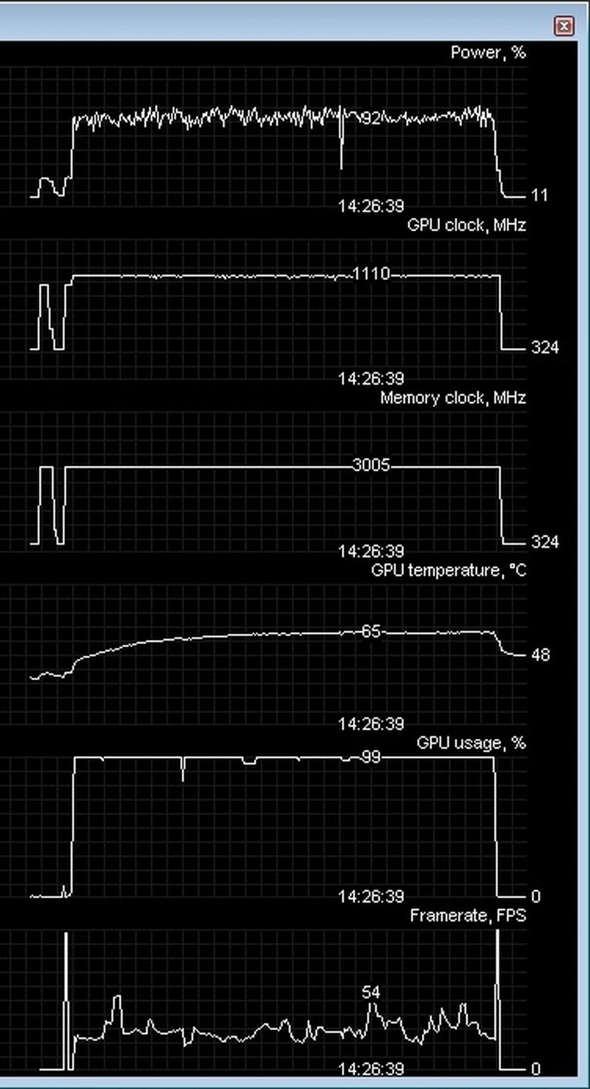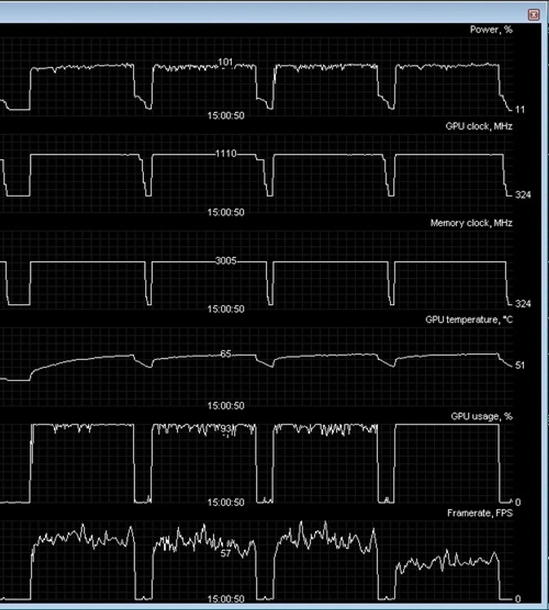 All graphs, from the monitoring logs of Extreme Precision X utility, seem to share a regular rhythmic pattern where you can figure out the pauses in the gaming benchmark to the load periods of it. The card again reaches a maximum of 1100MHz for its GPU clock speed while its power consumption hits an average value of 101% during the run of the benchmark. For the hardcore folks, do remember that you can get more out of the card from overriding its power target, but realistically, it won't go a lot higher than 110% in actual monitoring since the card has its own internal safety limits set in stone.