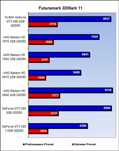 For our overclocking efforts, we made use of EVGA Precison X utility software. We managed to push the GPU Clock Offset slider to a value of 130MHz. For its memory subsystem, we managed to garner a headroom of 300MHz. For these settings, we left the voltage of the card at its default value of 0.987mV. NVIDIA GeForce GTX 680 managed to blaze ahead of the dual-GPU cards, besting AMD Radeon HD 6990 by a margin of approximately 4.4% at Performance settings! The other cards were trailing in its wake. At Extreme settings, GeForce GTX 680 was beaten by AMD Radeon HD 6990 by a margin of 3.6%. A close call indeed.