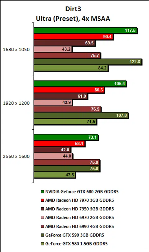 The GeForce GTX 680's impressive performance continued on Dirt 3 where it easily blitzed the Radeon HD 7970 by more than 25%. In fact, it also comfortably thrashed the dual-GPU Radeon HD 6990 and its results were comparable to GeForce GTX 590.