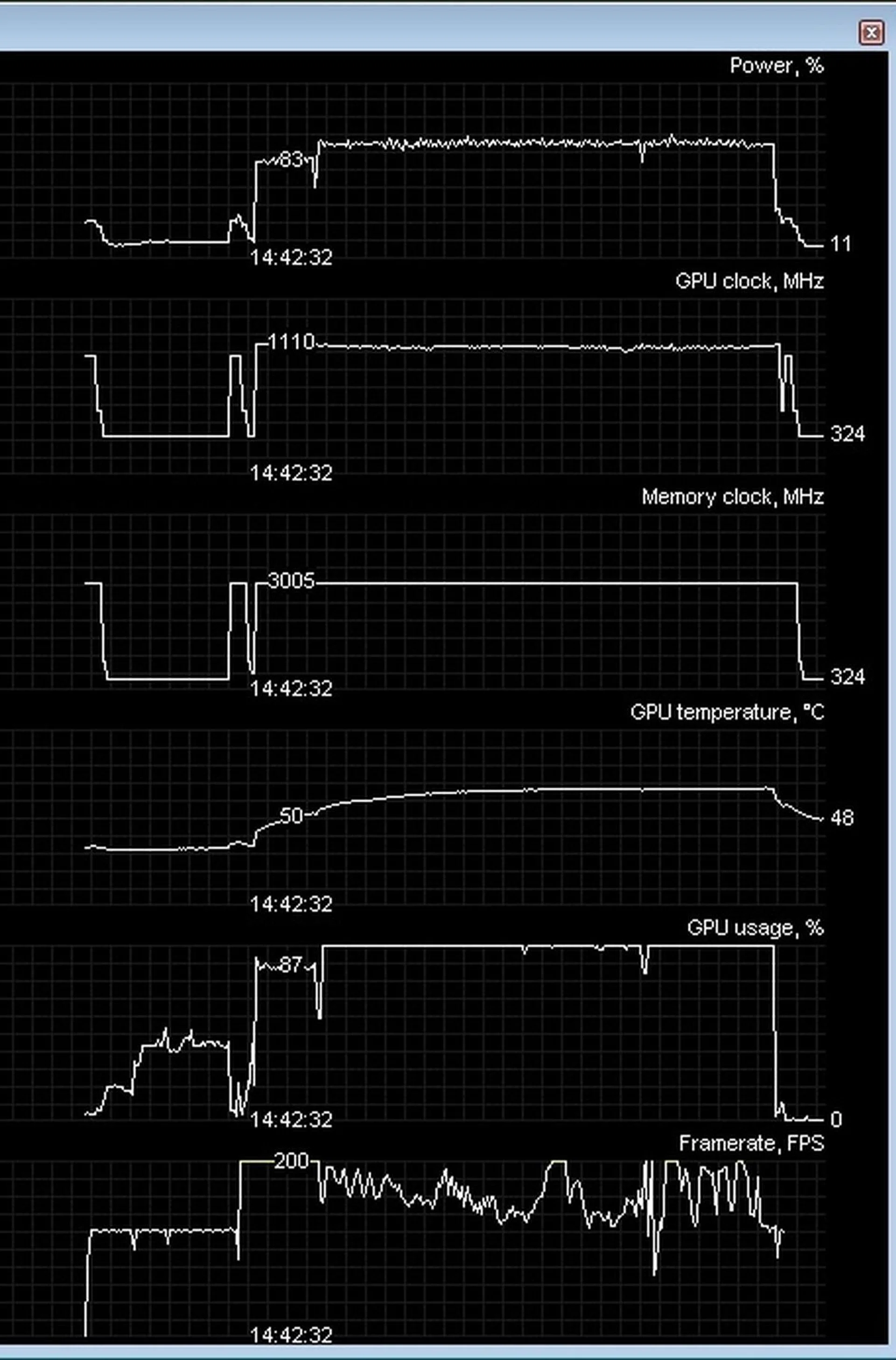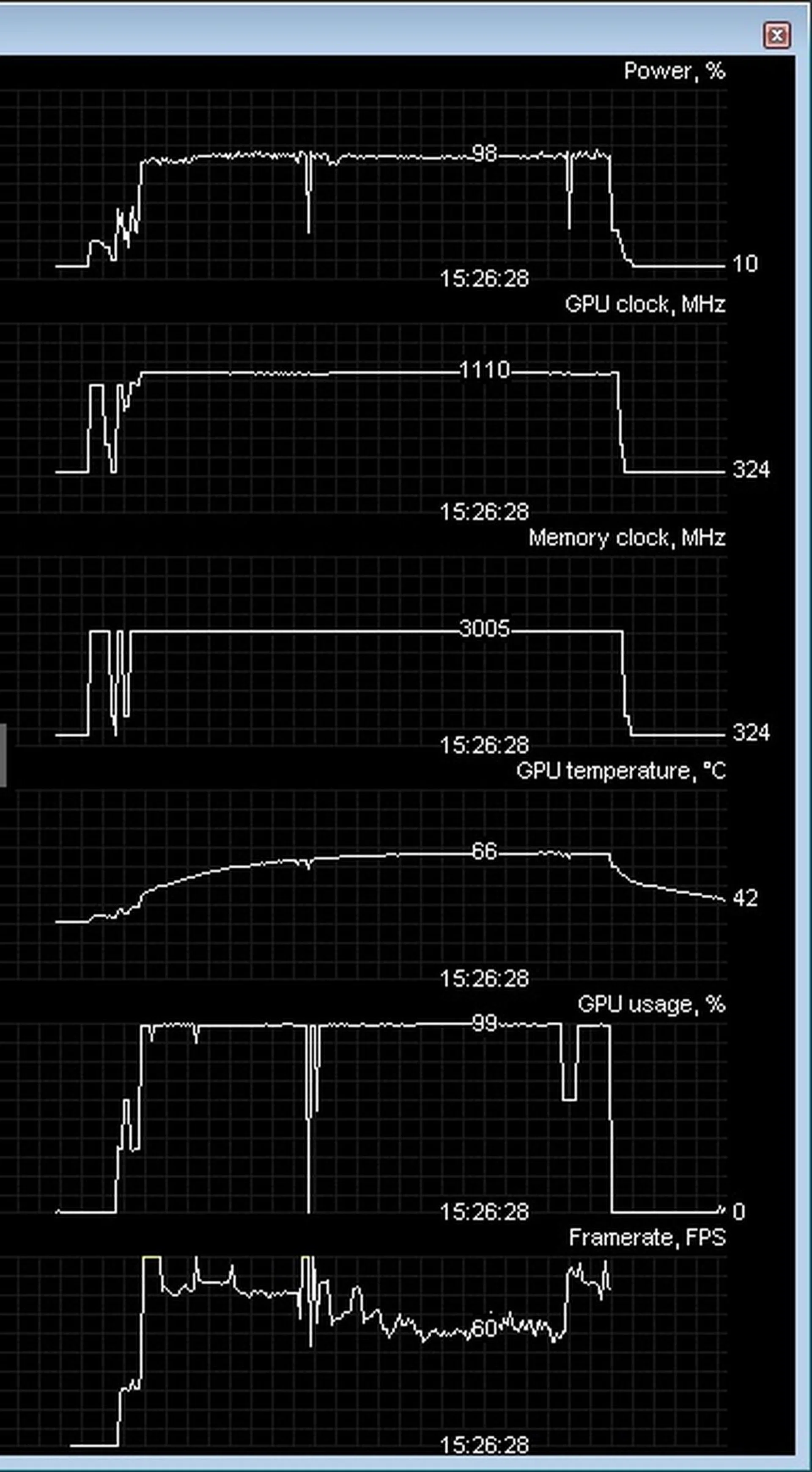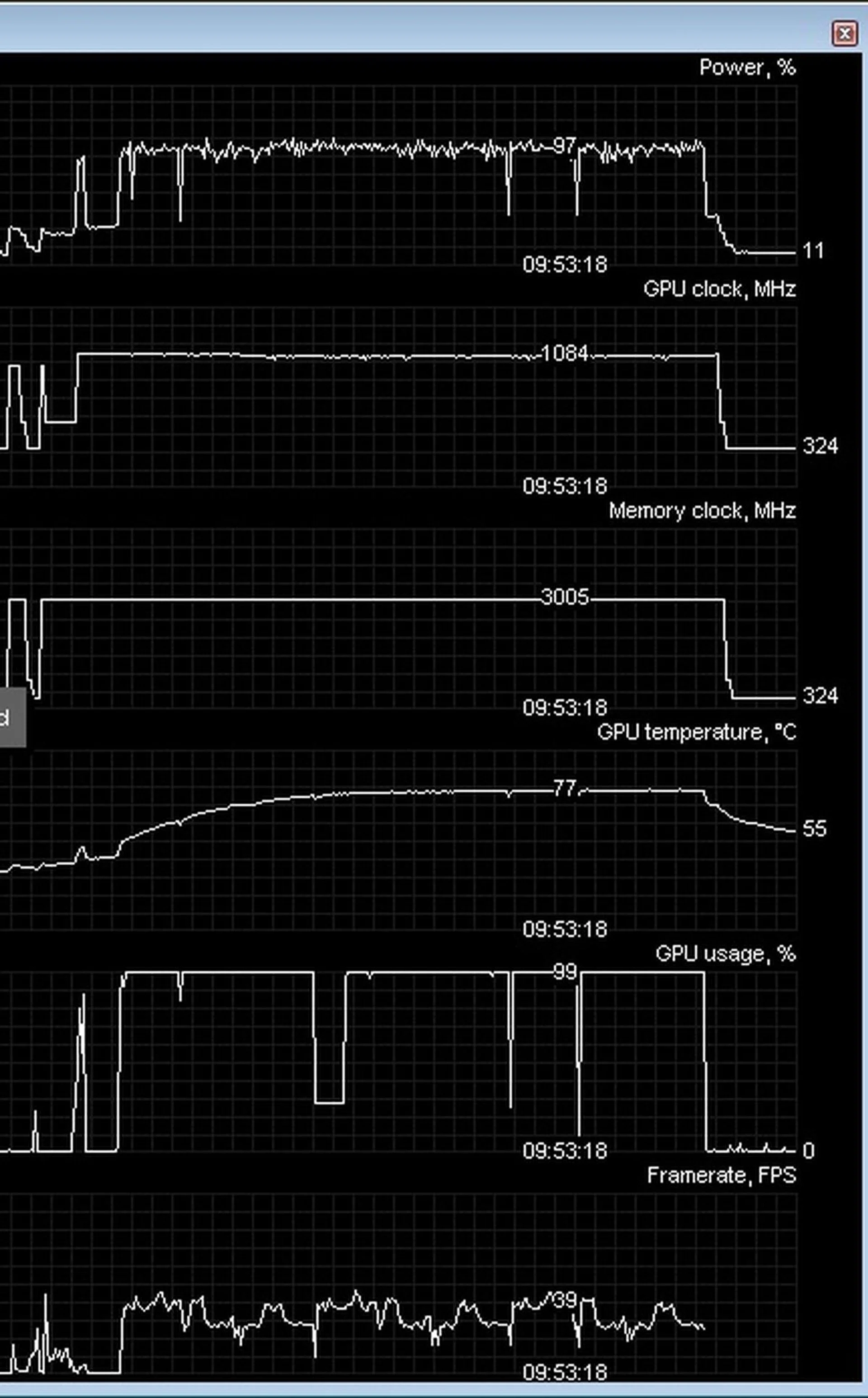 Notice that the GPU core clock speed hits a stable maximum of 1100MHz while its GPU usage hardly lets up at 99% during the duration of the benchmark. Power target level peaks out at 101%. Now that's effective use of the GPU Boost at work and definitely helps the card's performance too as seen from the results above.