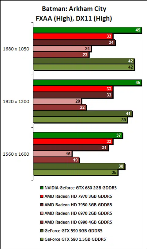 On Batman: Arkham City, the GeForce GTX 680 performed stunningly. On a whole, it was more than 15% quicker than the Radeon HD 7970 and was even quicker overall than the dual-GPU GeForce GTX 590 and Radeon HD 6990. Of course, we should also not forget that PhysX that's supported on the card contributed to the score further.