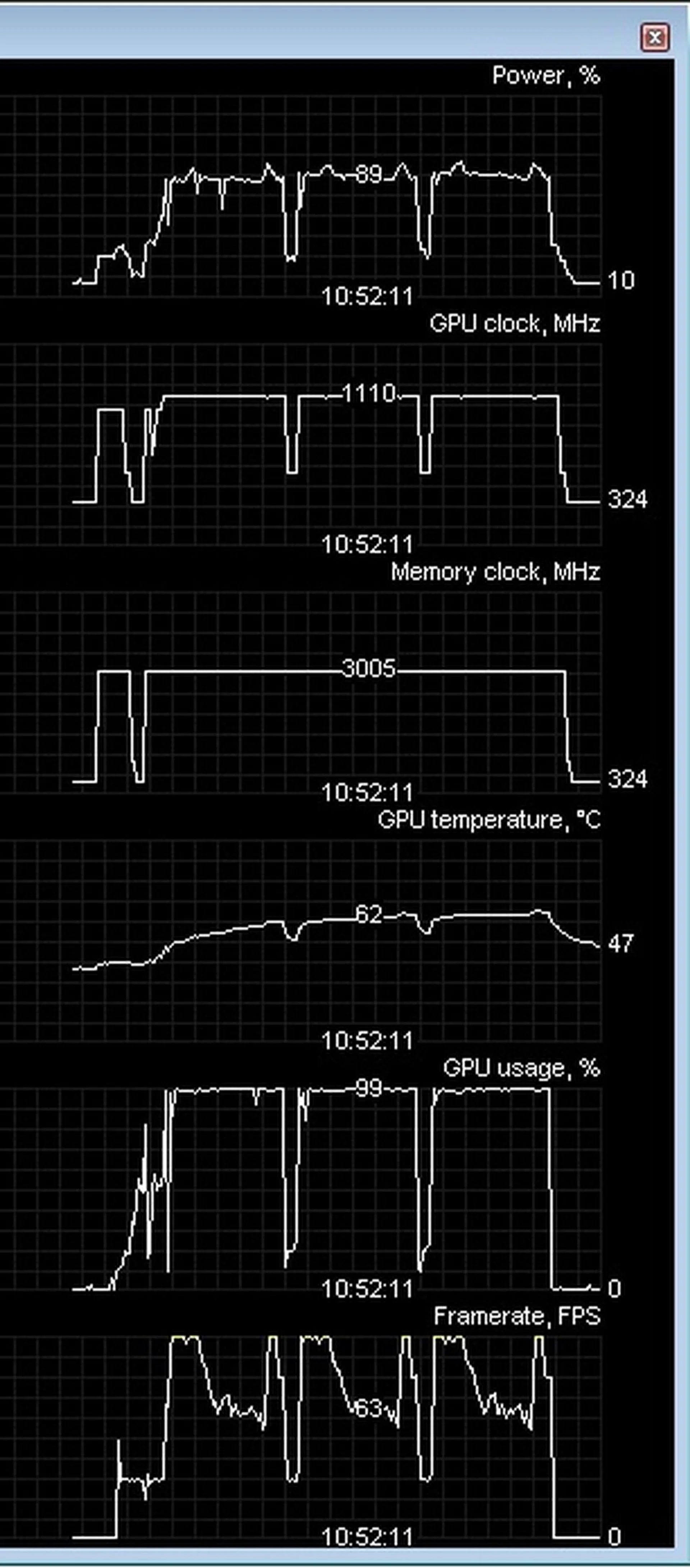 For the Far Cry 2 benchmark, the GPU clocks reached a maximum of 1100MHz, with power consumption at 89%. During the duration of the running the benchmark, its GPU temperature was roughly 62 degrees Celsius, cooler than its average temperature recorded for Crysis Warhead. In the graph, you'll notice three distinct segments because we used a benchmarking tool to obtain three consecutive runs in one flow.