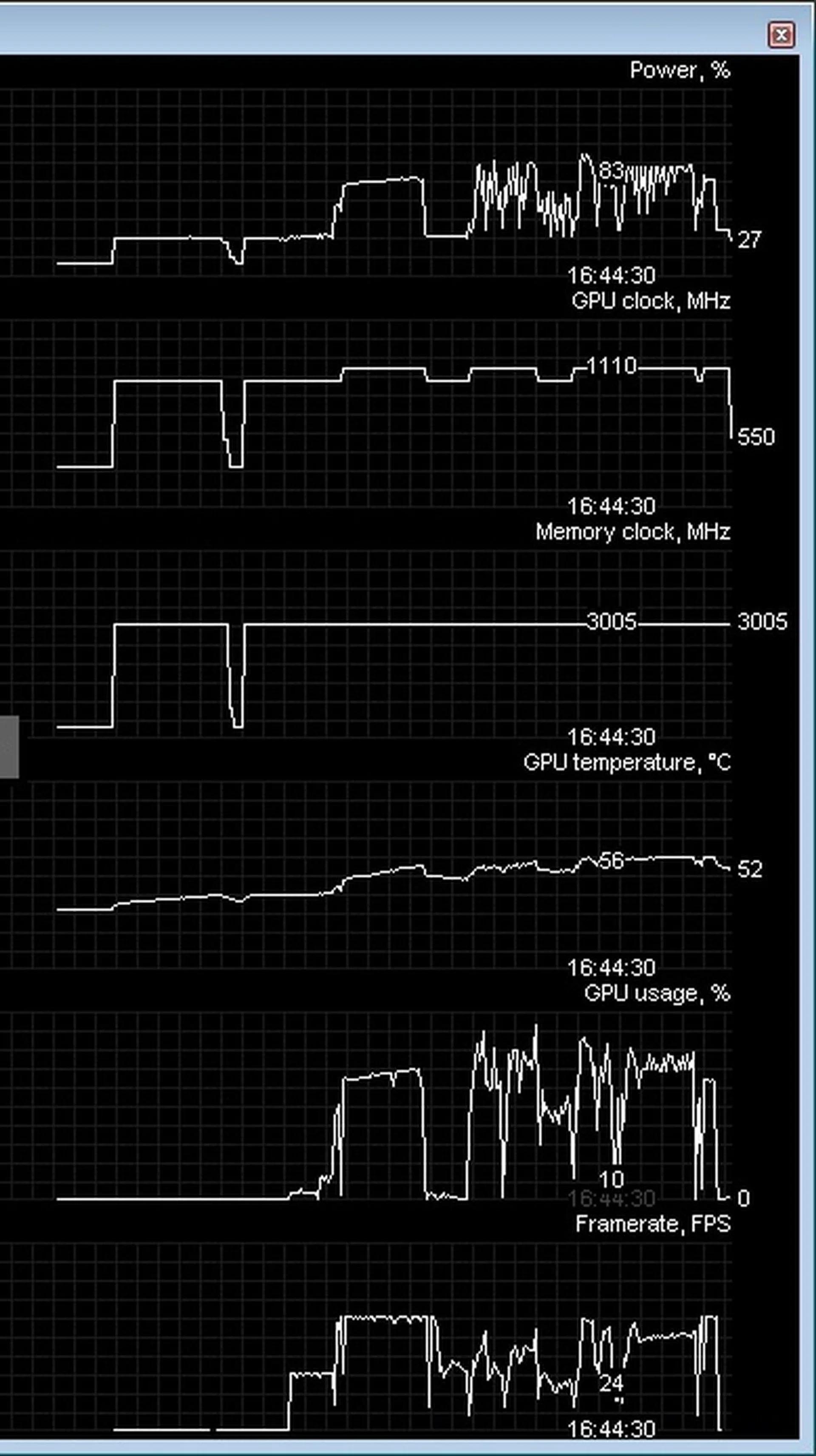 In Batman: Arkham City, the performance log was registering a large portion of GPU activity outside the actual gaming benchmark. The actual benchmark logging began when the power consumption graph was registering its wild swings. The GPU clock had its peak at 1100MHz with seemingly regular troughs at 1006MHz. GPU temperature averaged at about 57.0 degrees Celsius.