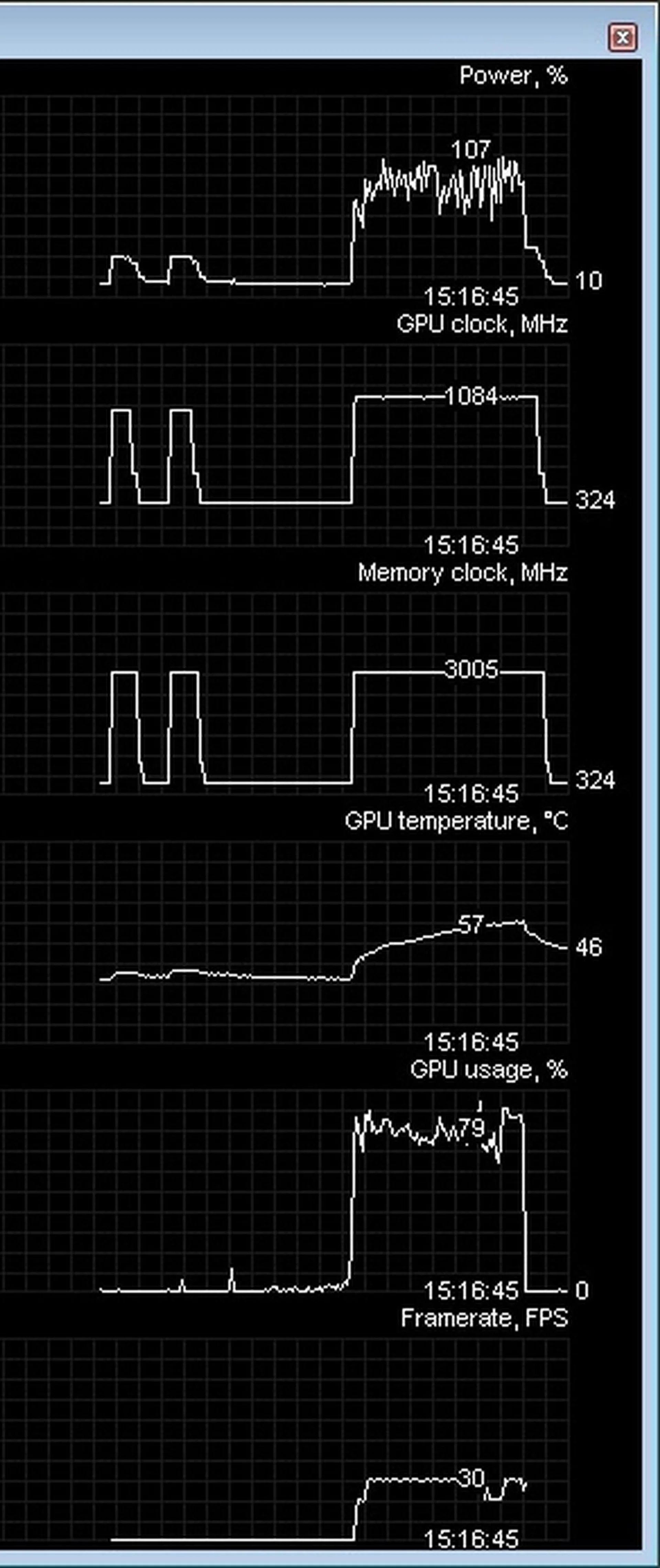 While running the gaming benchmark, we also fired up the performance log to have a look at the card's real-time performance. The snapshot below was obtained when we ran Battlefield Bad Company 2 with the highest settings used during our benchmark run to ascertain its performance under such load. Ignore the start and ending portions of the graph since those periods correspond to periods prior and after the benchmark routine.