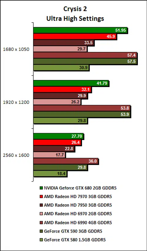 Moving on to Crysis 2, the GeForce GTX 680 continued to outperform the Radeon HD 7970. On the lower resolutions of 1680 x 1050 and 1920 x 1200 pixels, the GeForce GTX 680 was comfortably ahead of the Radeon HD 7970. However, when running at the ultra-high resolution of 2560 x 1600, the Radeon HD 7970 managed to restore some parity, but by then frame rates were already below the playable threshold of 30 fps. Perhaps a larger frame buffer for the GTX 680 would have helped.