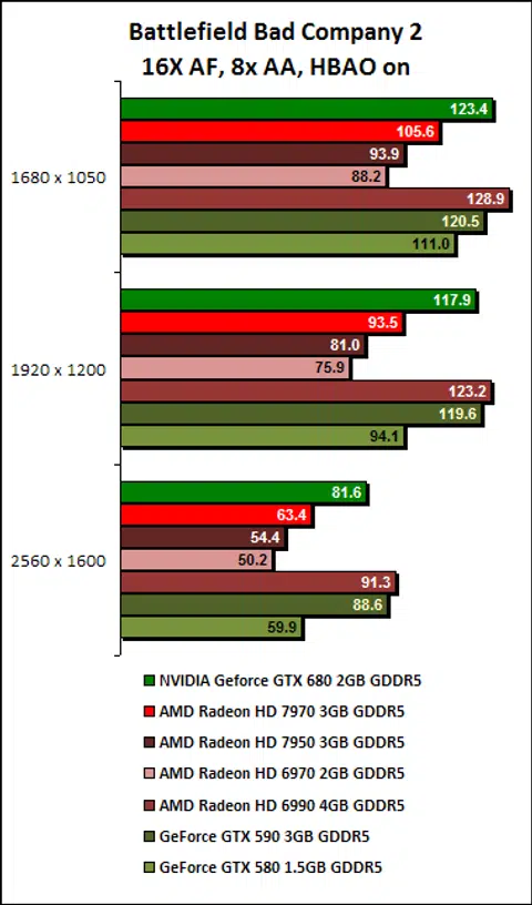 On Battlefield Bad Company 2, the GeForce GTX 680 once again posted impressive numbers. Overall, the GeForce GTX 680 was easily about 20% faster overall compared to the Radeon HD 7970. And despite the Radeon’s larger frame buffer, even at a resolution of 2560 x 1600 it couldn’t put up a fight against the sheer graphics-crunching horsepower of the GeForce GTX 680. Again, we noticed that the scores of the GeForce GTX 680 wasn’t that far from from the dual-GPU GeForce GTX 590 and Radeon HD 6990.