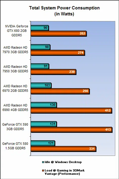 The GeForce GTX 680 has the third lowest power consumption and it was not as power efficient as AMD Radeon HD 7970 nor, the 7950 even though the new card has a lower TDP rating than the former. One reason for this outcome is due to the GPU Boost working in the background that is always trying to maximize the power budget of the GPU where possible. This means it is better utilized than other graphics cards of the past and as a result of its higher performance, you pay somewhat in its power consumption. At least it's much more efficient than the last generation of products. Overall, given its performance aspects, we think the power consumed is reasonable.