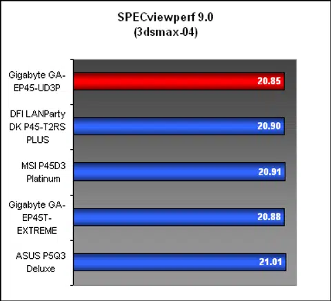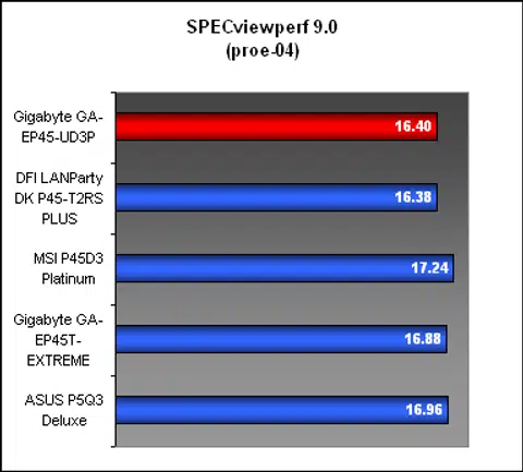 In SPECviewperf 9.0, the Gigabyte produced scores in the 3dsmax and PRO/ENGINEER test segments that were on par with the DFI board, which is good despite the memory timing differences.