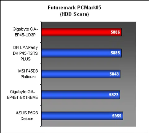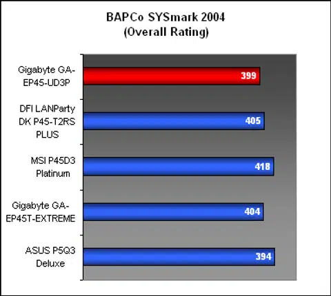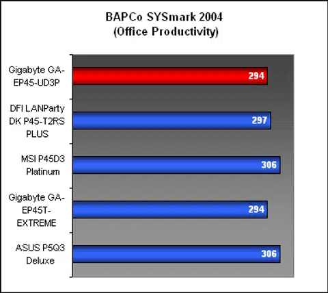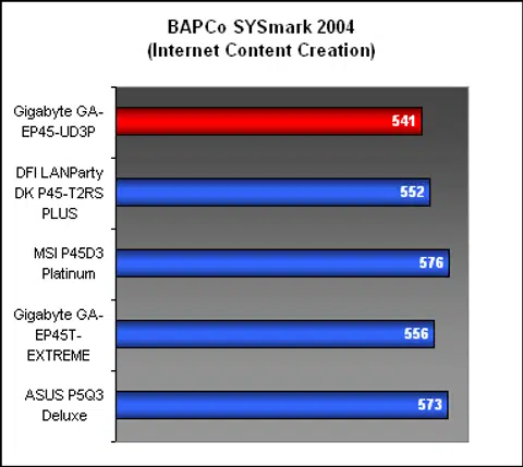 With its slower memory timings (the same standard we use for motherboards running DDR2-1066), it was perhaps not too surprising that the Gigabyte EP45-UD3P turned up slower than the DFI running DDR2-800 at tighter timings in our first benchmark, SYSmark 2004. Still the differences are small and are well within the general deviation allowance. However, compared to the performance of the Gigabyte EP45T-EXTREME, the UD3P was not too far off and would actually represent better value for its performance.