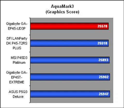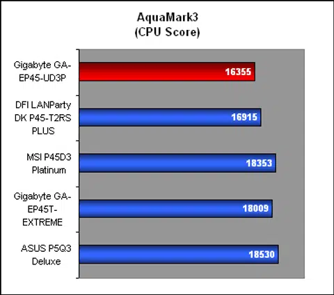 The CPU score in AquaMark3 for the Gigabyte was only marginally behind the DFI, something that we have to attribute to its memory timing, though the board made up for that in the Graphics score. Overall, both boards were a fair bit behind for the CPU performance, which meant the DDR3 boards certainly look better for the high-end enthusiast.