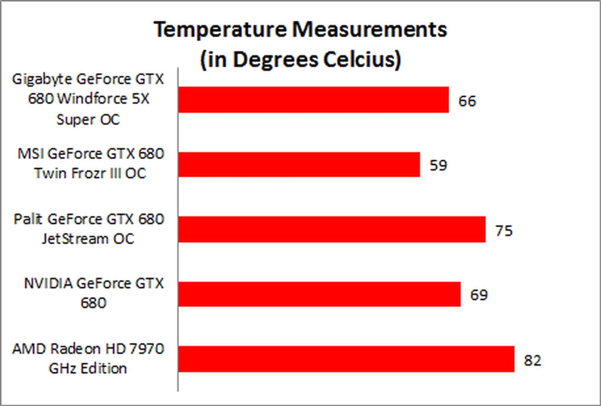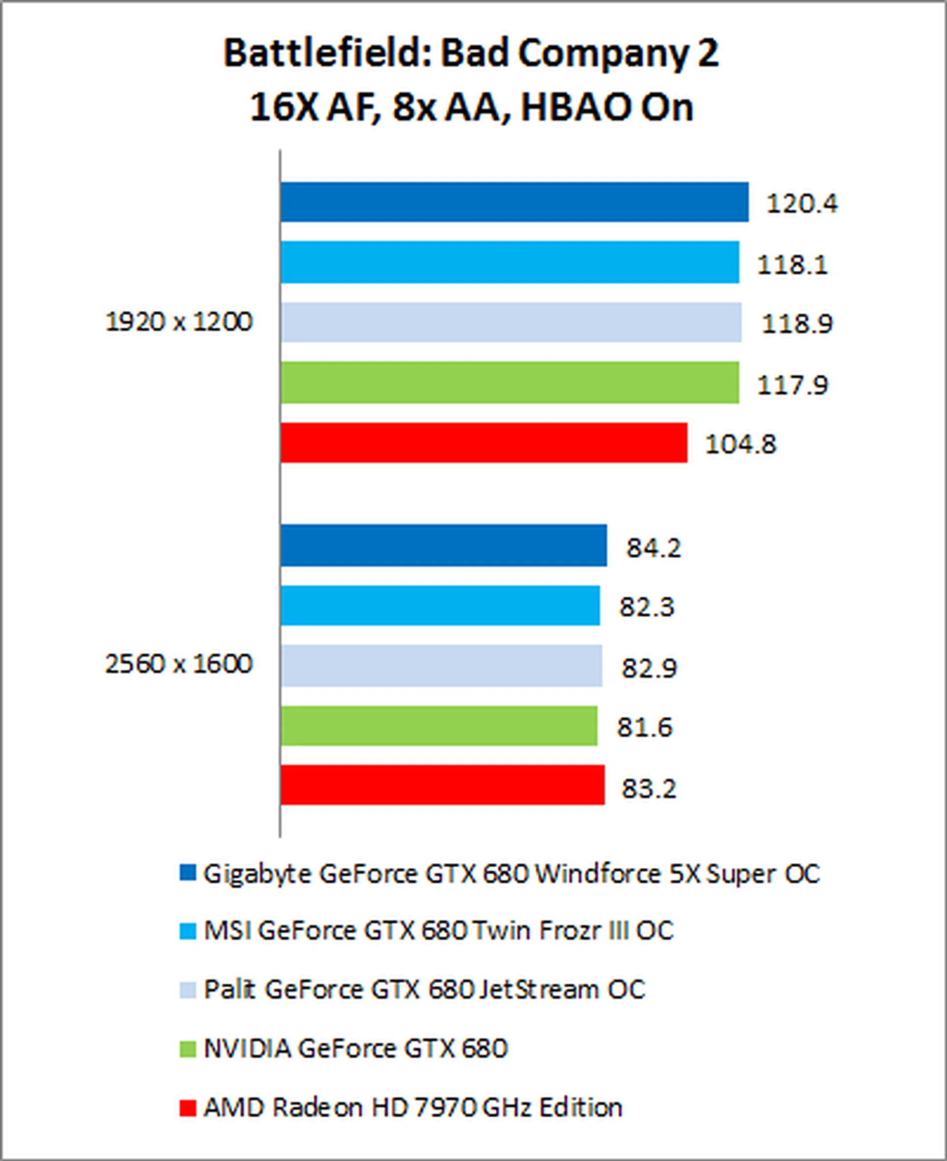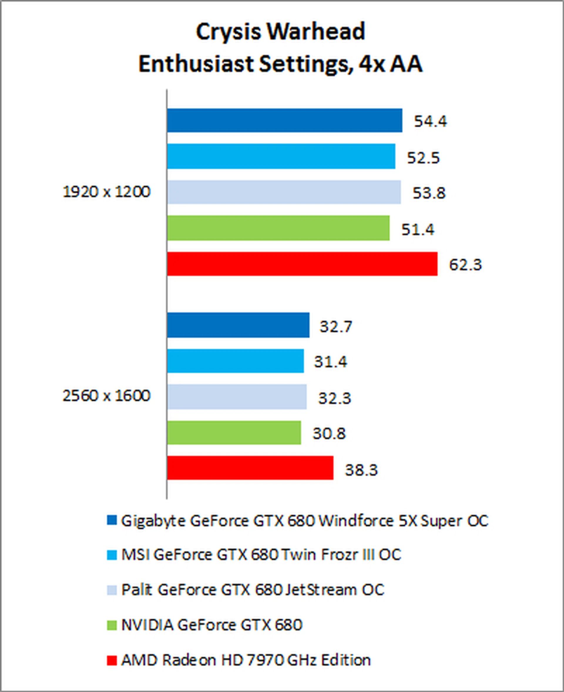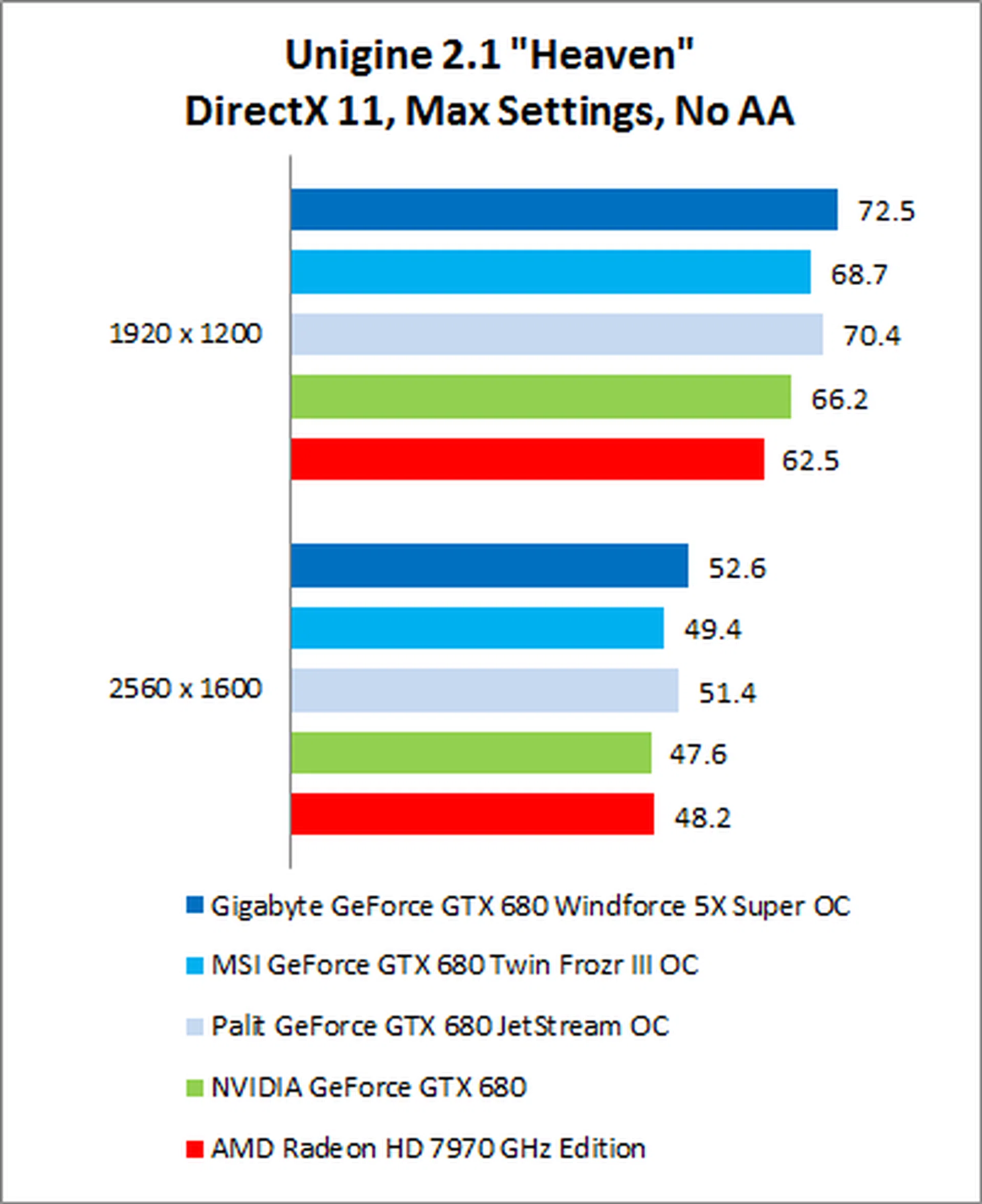 Compared to our other GTX 680s, as expected, the Gigabyte Super OC was able to outperform its competitors on every benchmark. However, its lead was not as massive as one might expect, given its clock speeds and 'Super OC' designation, and it only beat our next best competitor, the Palit GTX 680 JetStream OC by about 2-4% on average. While the difference is small, this is about the expected norm. Against the reference design, it was about 15% better in general. This advantage is the reason you'll be paying a premium out of the box.
