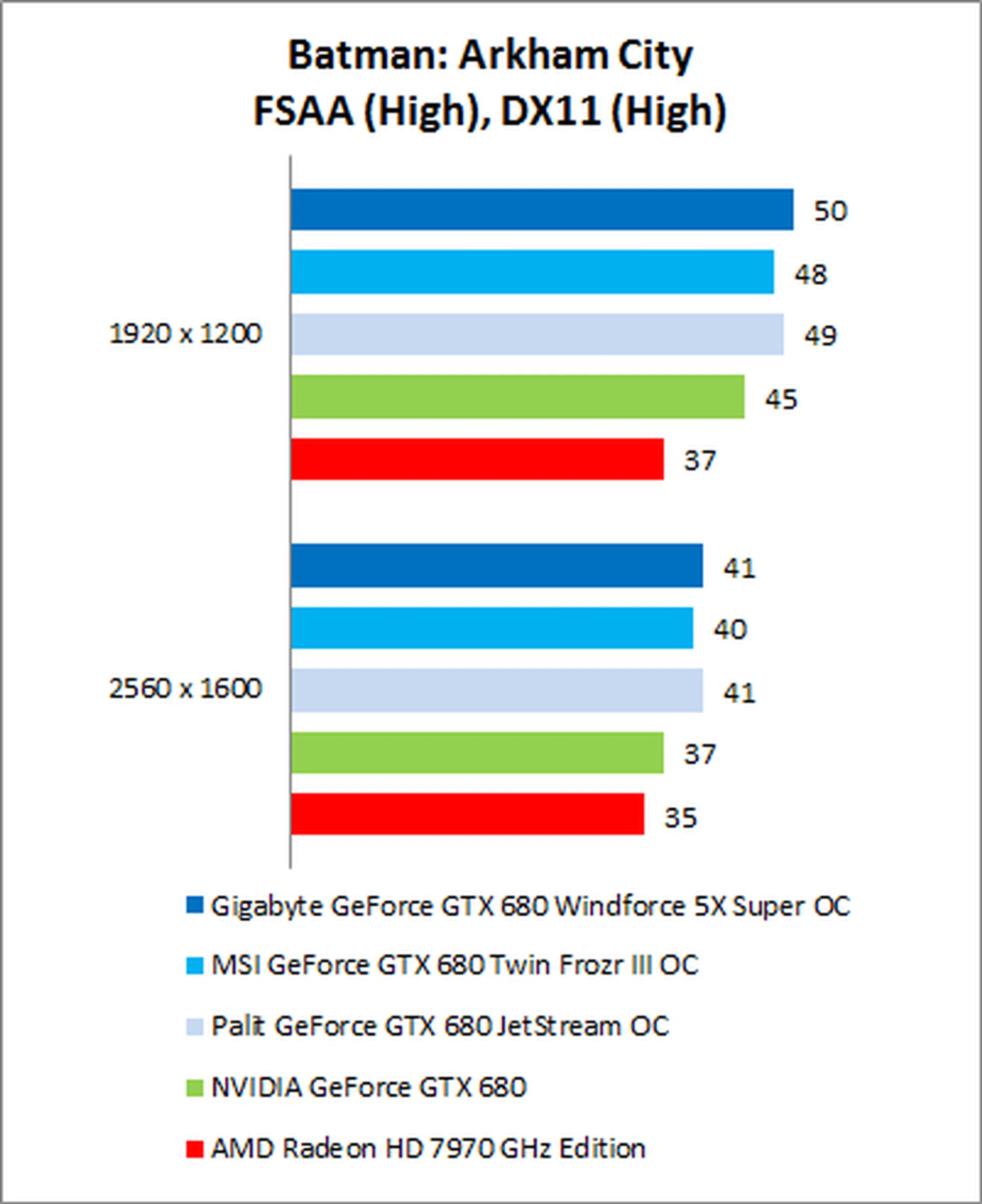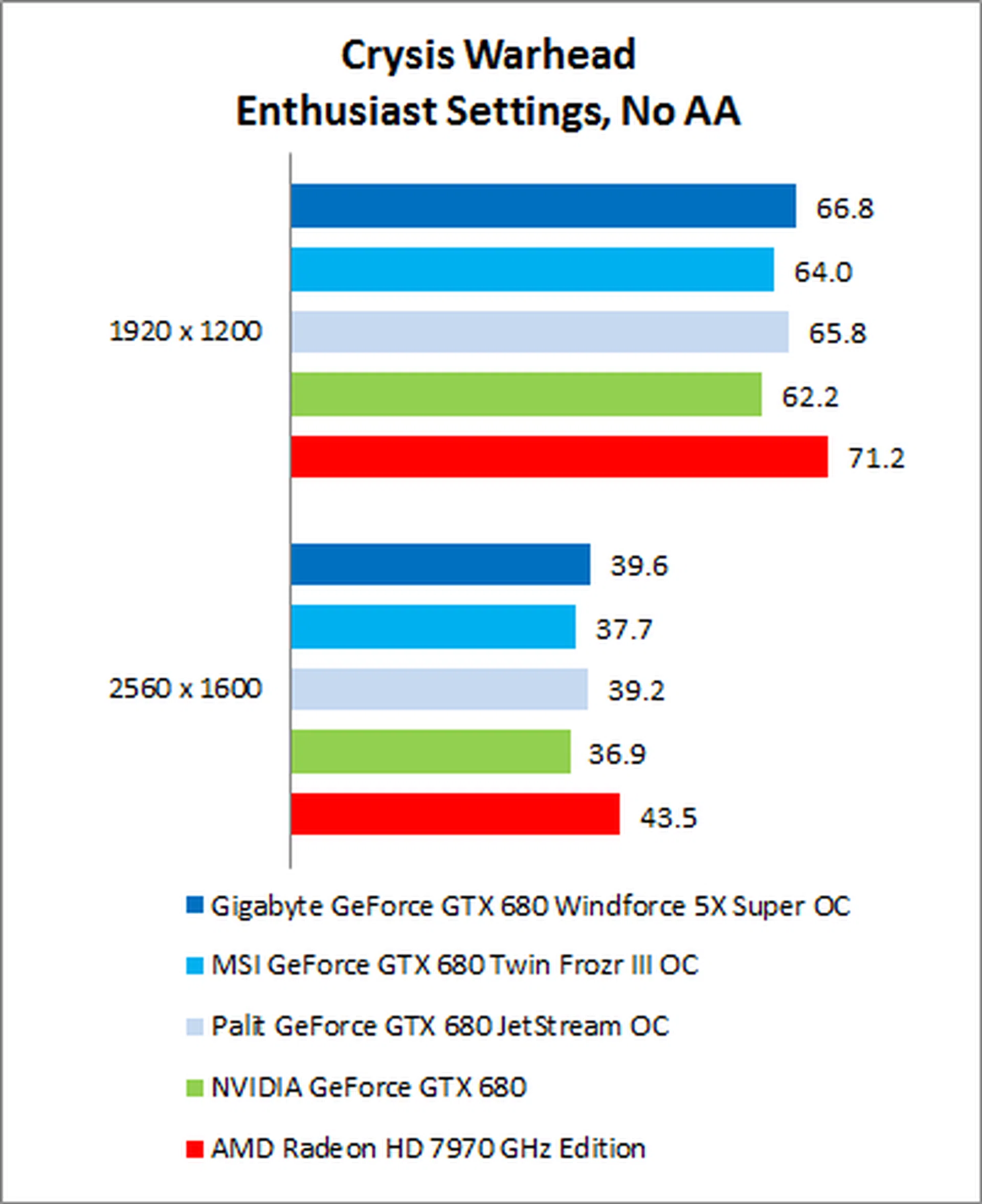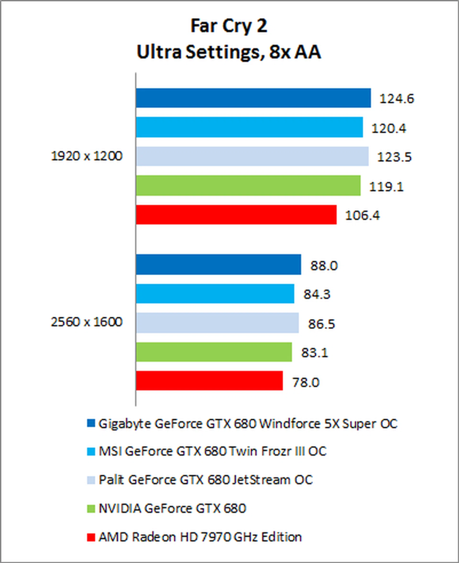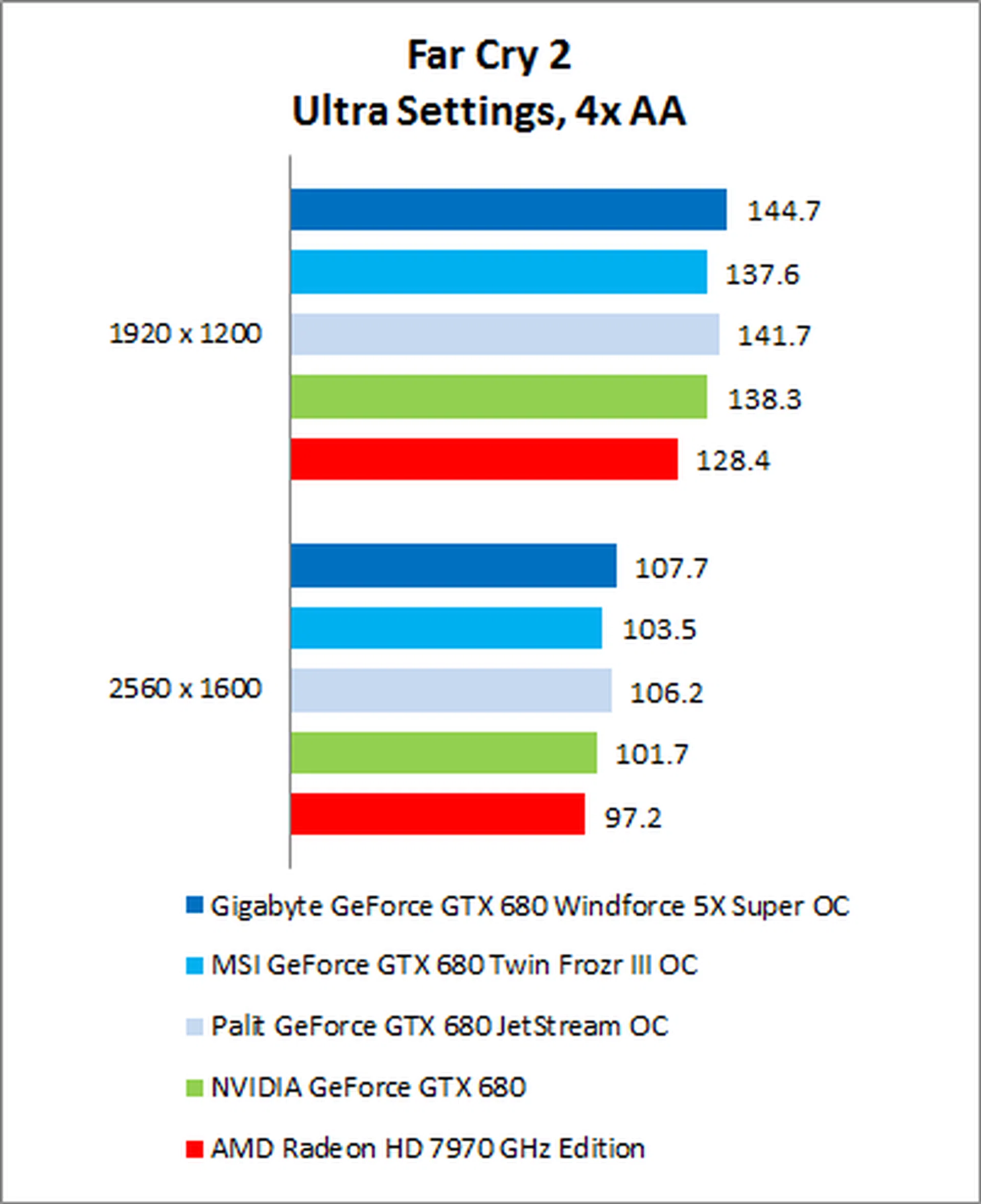 Compared to our other GTX 680s, as expected, the Gigabyte Super OC was able to outperform its competitors on every benchmark. However, its lead was not as massive as one might expect, given its clock speeds and 'Super OC' designation, and it only beat our next best competitor, the Palit GTX 680 JetStream OC by about 2-4% on average. While the difference is small, this is about the expected norm. Against the reference design, it was about 15% better in general. This advantage is the reason you'll be paying a premium out of the box.
