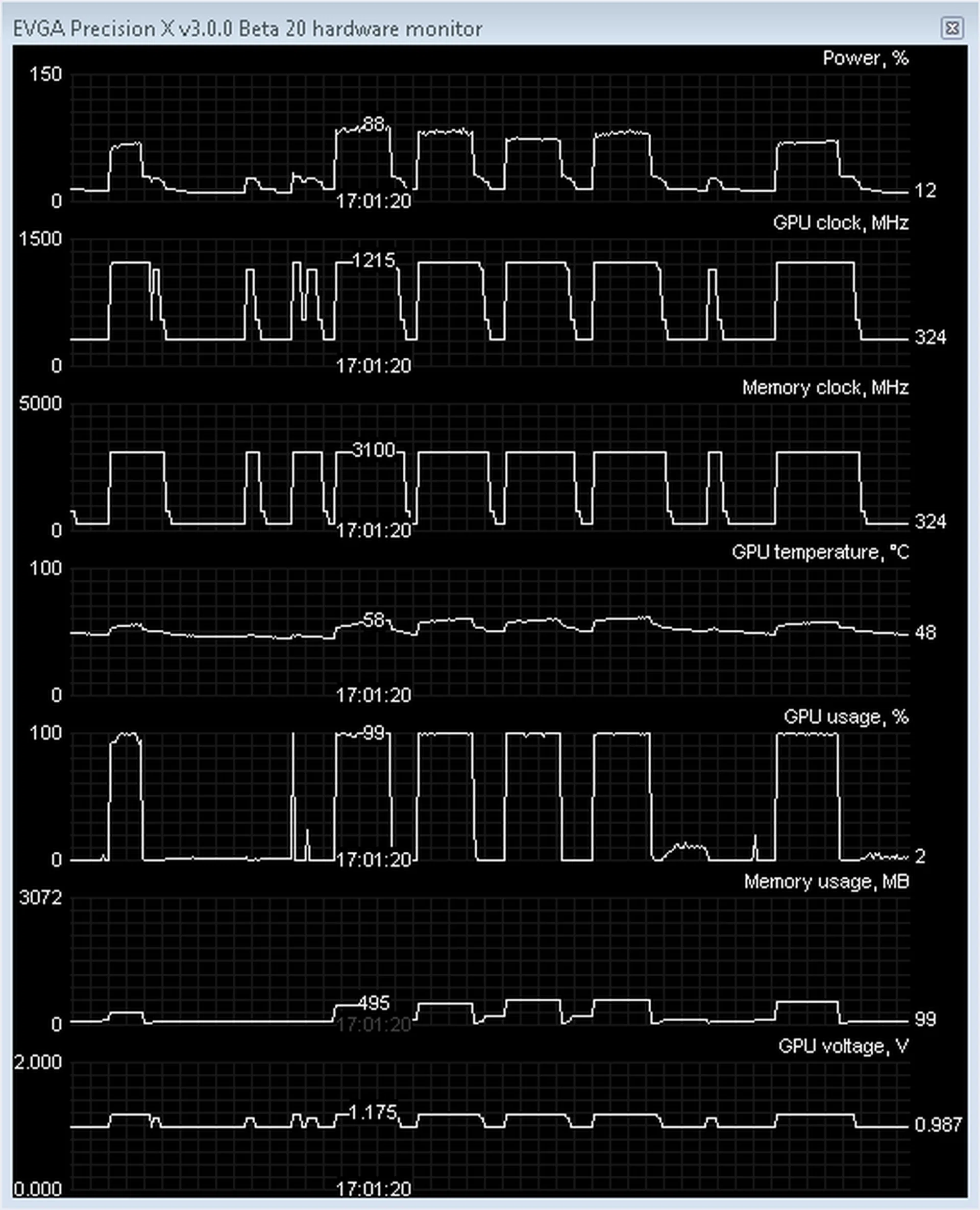 Part of the reason for Gigabyte's slightly subpar score may be due to its underwhelming GPU Boost performance. Our other custom cards, as well as NVIDIA's reference card, average a peak of about 100MHz extra core clock speed due to GPU Boost. On the other hand, Gigabyte's GPU Boost capped out at 1215MHz, which is only 78MHz above its default clock speed. This may be due to the high power draw required by the card's custom cooler, which would then reduce the excess power available to be utilized by GPU Boost.