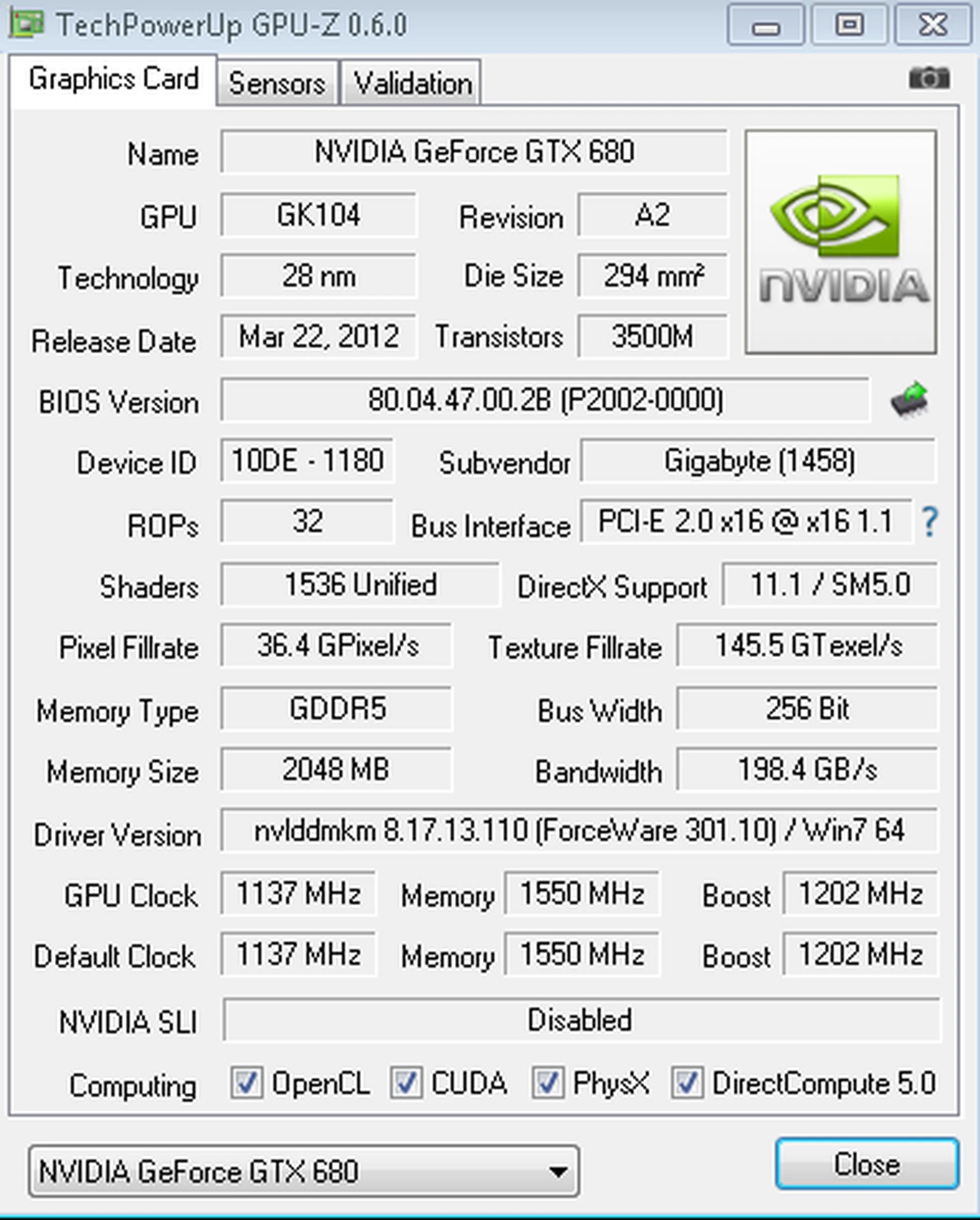 - Gigabyte GeForce GTX 680 Windforce 5X Super OC 2GB GDDR5 (ForceWare 301.10)