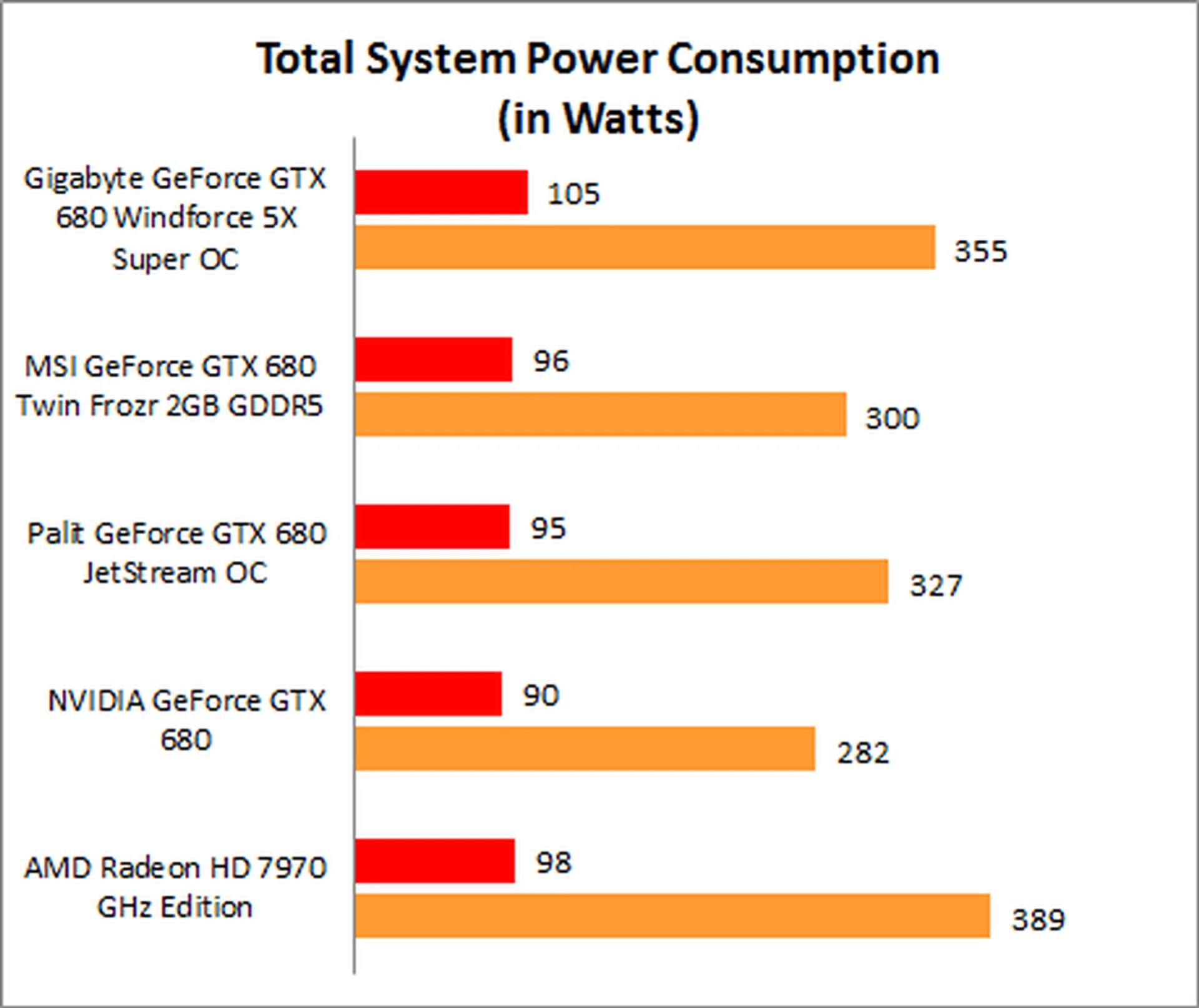 As expected, Gigabyte was the worst performer in terms of power consumption, drawing 25% more power than the reference design at load. As we saw in our benchmark results, the extra power requirement seemed to stem from its highly overclocked GPU and its many cooling fans as we didn't register a higher GPU Boost.