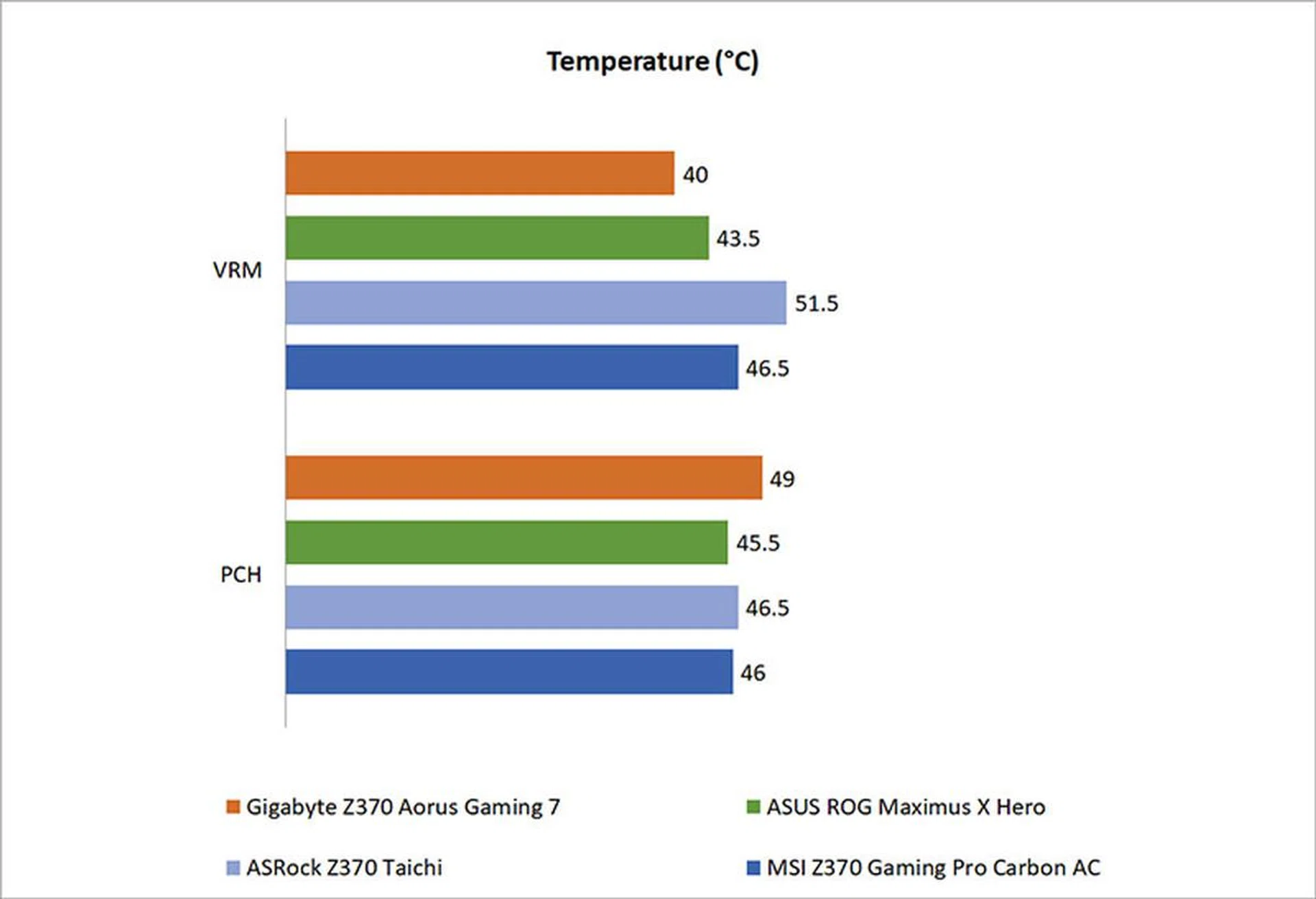 That said, the Gigabyte board recorded the lowest VRM temperatures, but the highest PCH numbers. The board does come with a fan under its I/O shield for the express purpose of lowering VRM temperatures, so it’s good to see this paying off in practice.