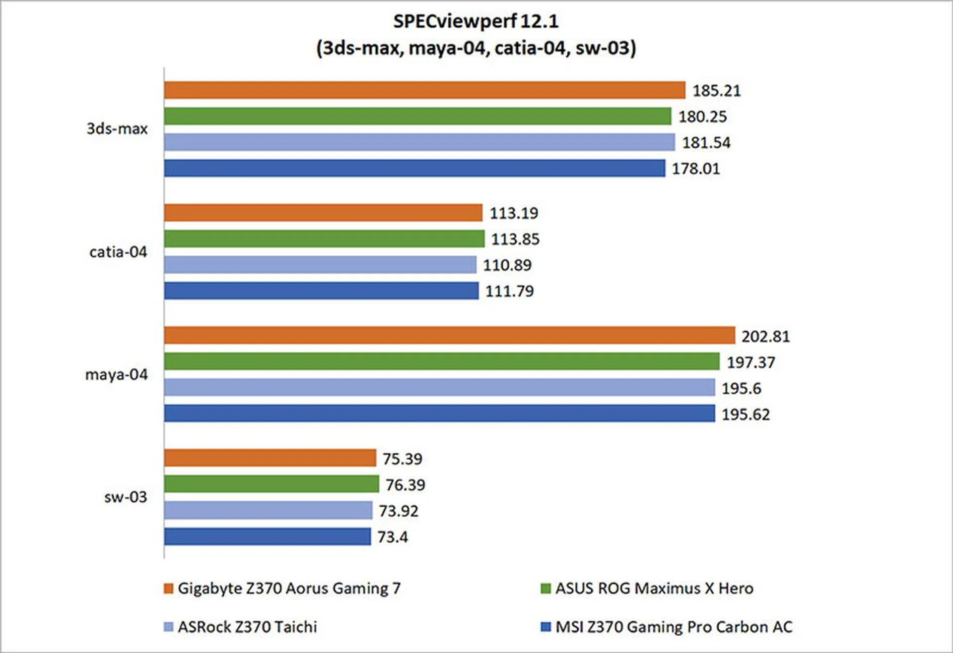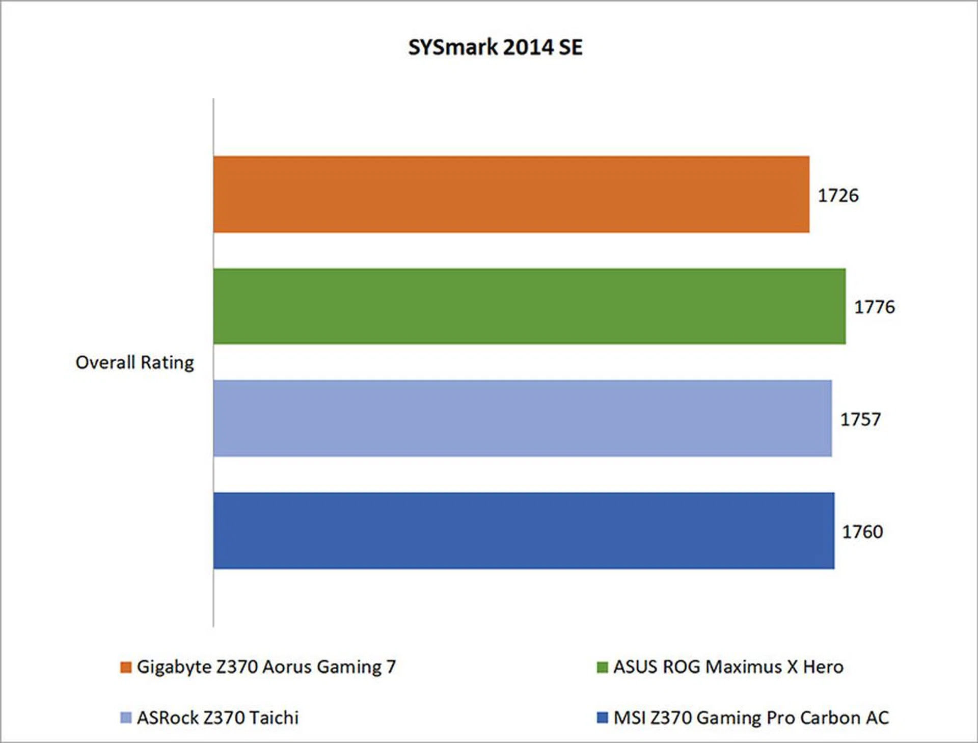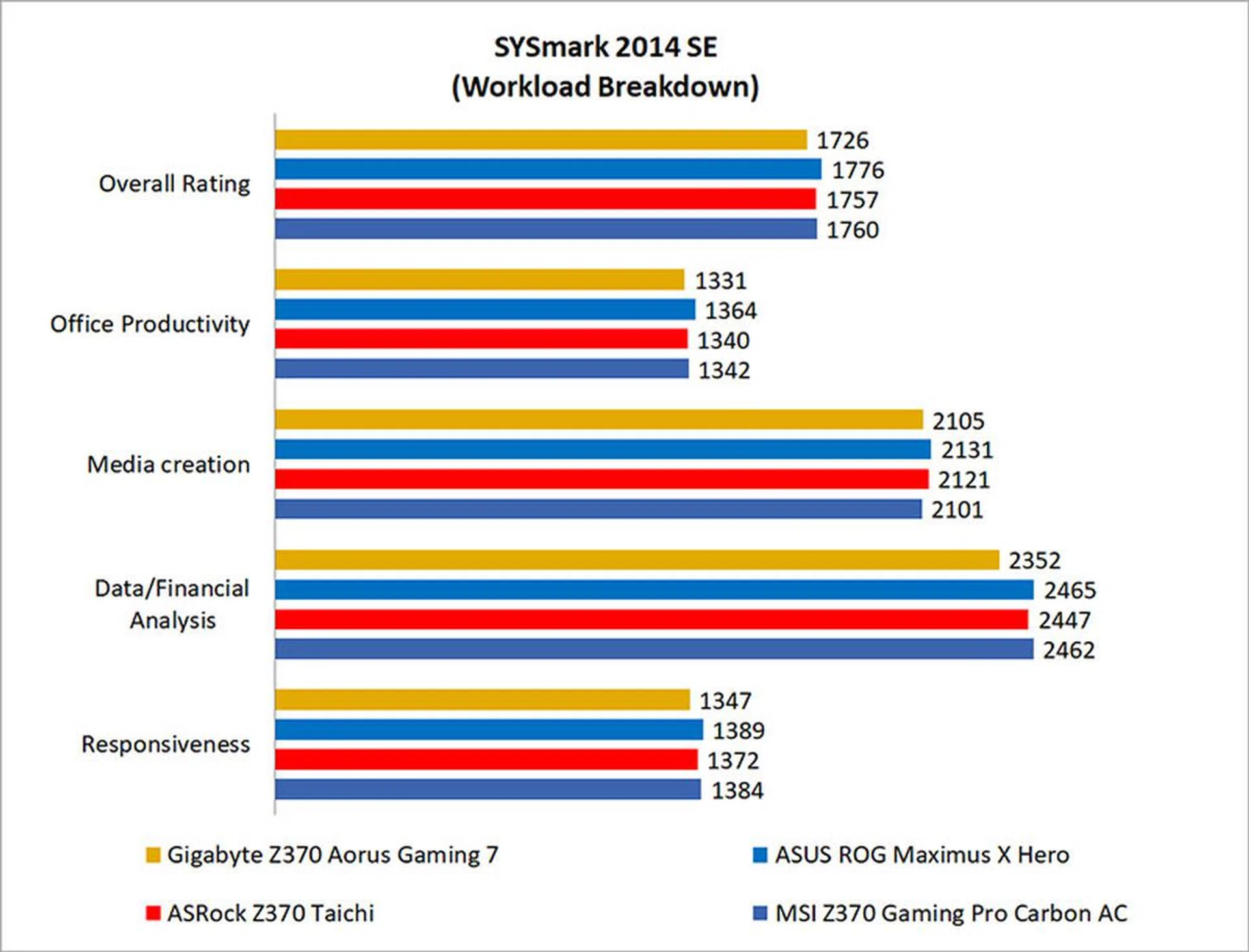 Unsurprisingly, there’s little to distinguish the boards in SYSmark, and they performed very similarly given the otherwise identical configurations. But even though the Gigabyte board looks like it is the bottom performer in terms of overall scores, the difference between the ASUS ROG Maximus X Hero and the former is just under 3 per cent - which is within a reasonable tolerance of deviation.