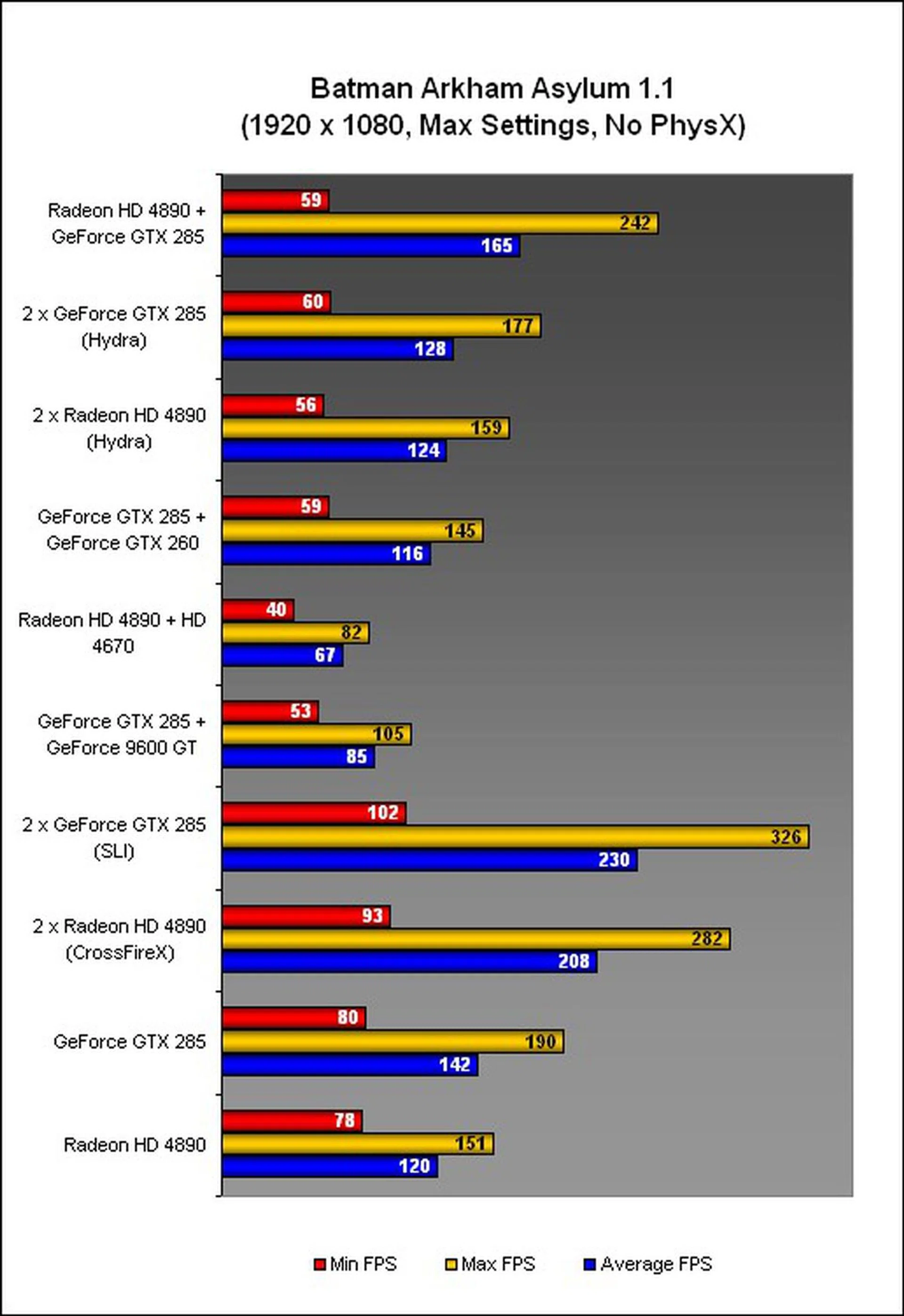 For the ultimate proof of concept for mixing and matching ATI and NVIDIA graphics cards, the Radeon HD 4890 and GeForce GTX 285 worked in the games tested but the performance was mixed though we don't really have a direct comparison to this unique mode.