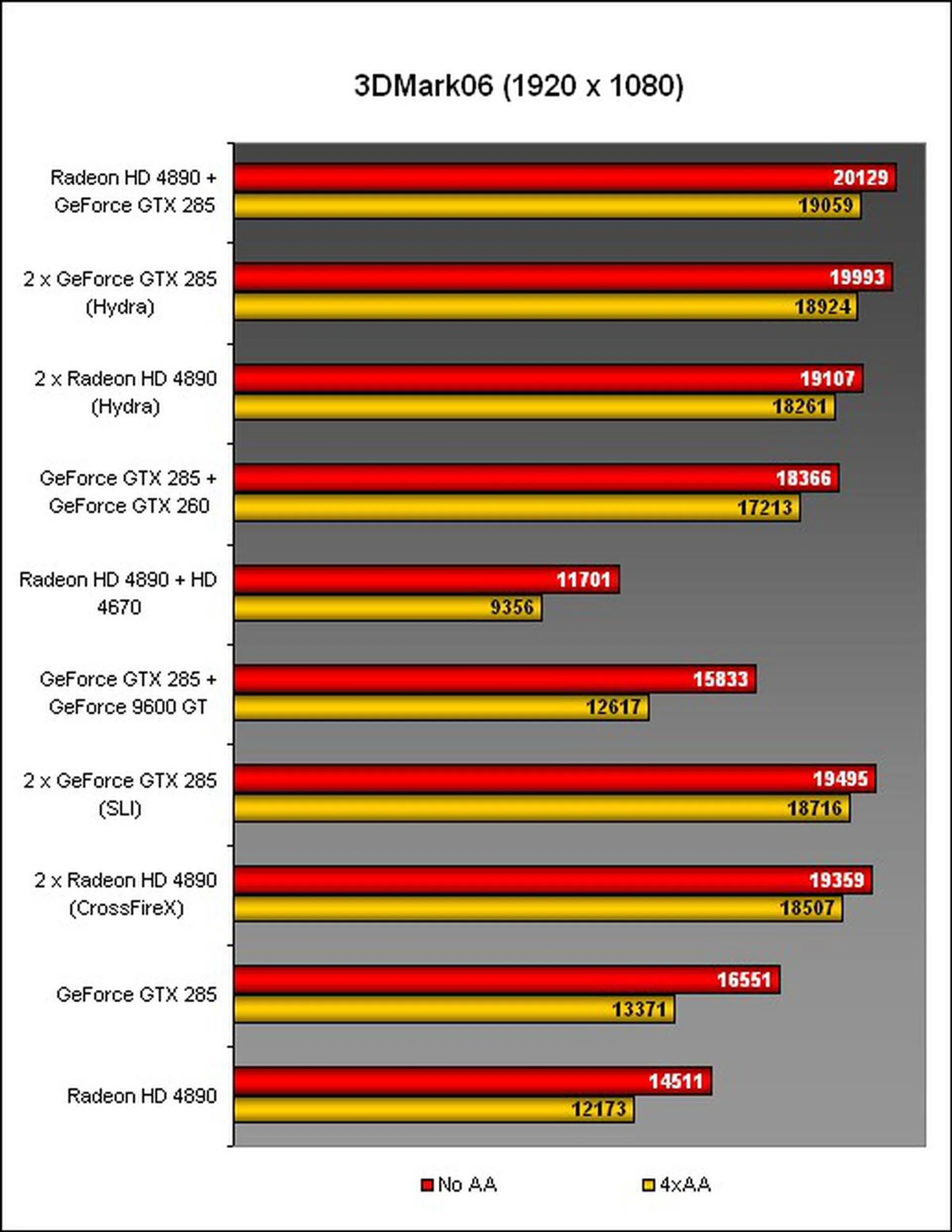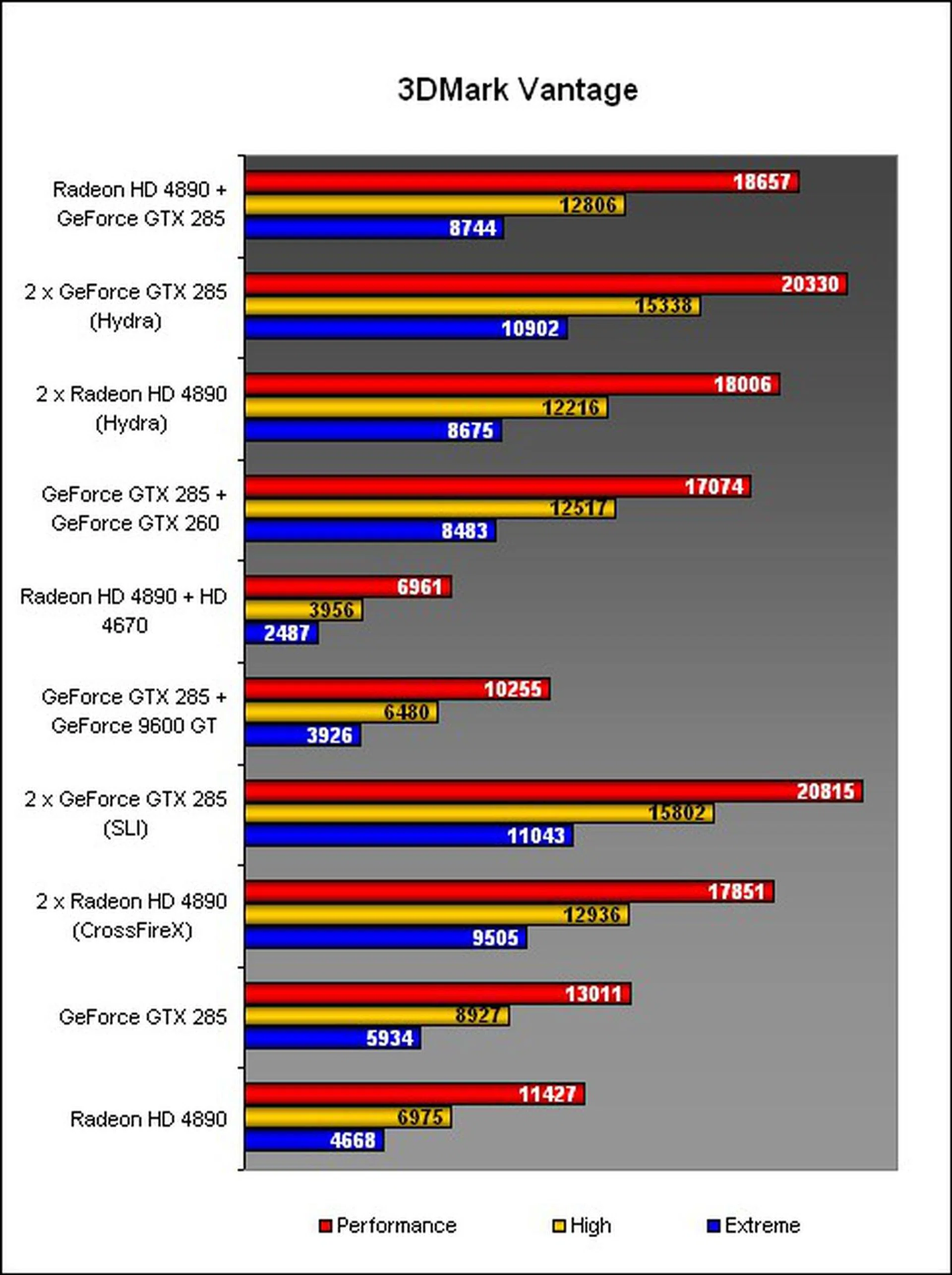 - Multi-vendor (X-Mode) - Radeon HD 4890 and GeForce GTX 285 (Catalyst 9.12 and ForceWare 195.62)