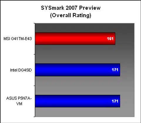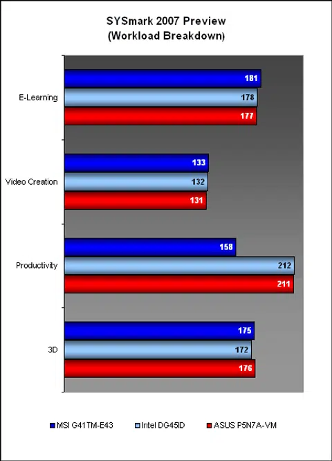 As usual, we started our benchmarking with a system benchmark, SYSmark 2007, to find out how the MSI G41TM-E43 performed in a number of everyday applications. While the Intel G45 and NVIDIA 9300 mGPU boards were essentially tied in performance, the MSI was about 6% behind. Its main weakness was in the Productivity segment, which was directly attributed to its hard drive performance of the less capable non-AHCI Southbridge of the ICH7 chip. Besides this segment, the MSI was on par with the rest.