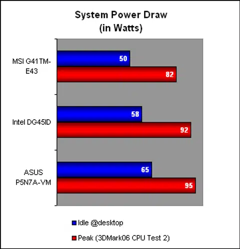 Here was another area where the Intel boards had the advantage. However, it was only a slight one for the G45, something that the MSI G41TM-E43 had improved on, what with the company's Green Power and dynamic phase switching technologies. For both idle and peak, you can expect the MSI to turn in better results than the reference Intel G45 motherboard.