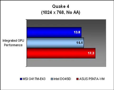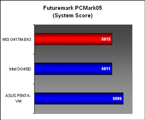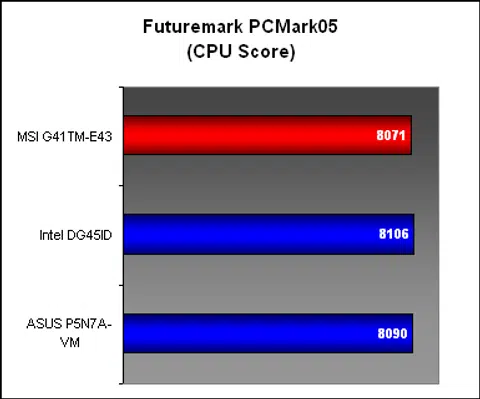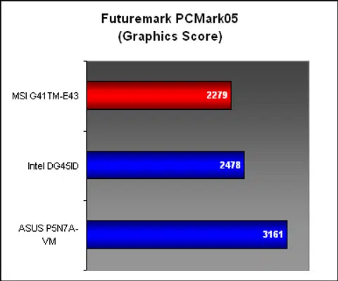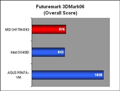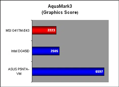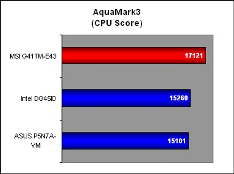 Surprisingly, the MSI board produced a CPU score in AquaMark3 that was higher than the other boards. Its graphics performance however was similar to what we had seen so far, which was slightly below that of the G45.