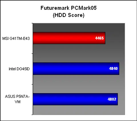 PCMark05 mostly confirmed our earlier results, with the overall system score for both the G41 and G45 motherboards coming out level. Both were significantly slower than the NVIDIA board. While the G45 and the MSI boards were equal for most segments, the graphics and hard drive sections favored the G45, the latter more so, which we had previously attributed to the ICH7 Southbridge.