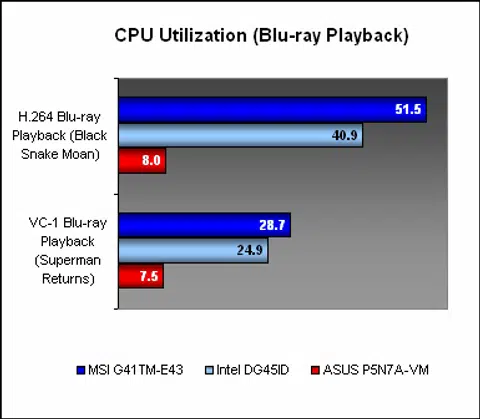 Without full hardware acceleration, we had expected the MSI board to produce higher CPU utilization numbers and this was indeed the case. The H.264 test involving Black Snake Moan had a higher average bitrate, thus consuming more CPU cycles for both Intel boards. However, the G41 was up to 25% more CPU intensive than the G45. This margin was narrowed in the VC-1 example but it was still about 15%. Still, this shows that even the Intel G41 based motherboards are adequately capable of tackling high-bandwidth HD content with a reasonably fast CPU.