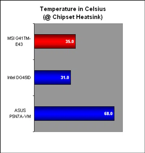 When it came to the temperature test, the MSI G41TM-E43 felt a bit warmer than the G45 but both chipsets should perform similarly. Perhaps the slightly larger heatsink on our Intel G45 sample made the difference. Here was also where the NVIDIA chipset appeared vulnerable, with its temperature readings very much higher than the Intel chipset based solutions.
