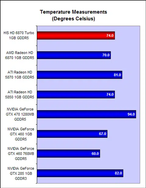 Elsewhere, power consumption figures are still comparable, although we noted that the factory overclocked HIS HD 6870 Turbo recorded slightly higher power readings while at load. Heat is a slight concern however, because with its maximum recorded temperature of 74 degrees Celsius, it is a good 4 degrees warmer than a stock Radeon HD 6870. It seems that HIS has done little in the way of optimizing the card to run cooler.