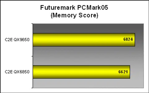 PCMark05 was another staple benchmarking platform that didn't really register much performance differences between the QX9650 and QX6850. At such speeds and power, both CPUs breezed through the benchmark without breaking much of a sweat. Even though PCMark05 is multi-threaded, its workloads did not seem to stress the processors enough. However, thanks to the QX9650's larger and more efficient cache and memory management enhancements, memory subsystem specific workloads showed a 3% performance boost.