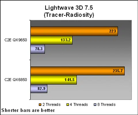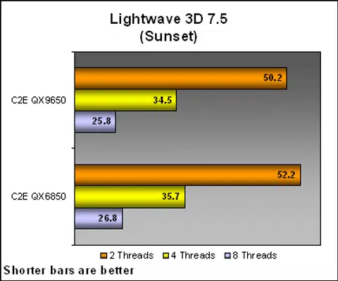 In Lightwave 3D, we again get to see a constant and consistent improvement of multi-threaded performance on the QX9650 over the QX6850. This was evident even in less in a less stressful rendering workload such as Sunset.