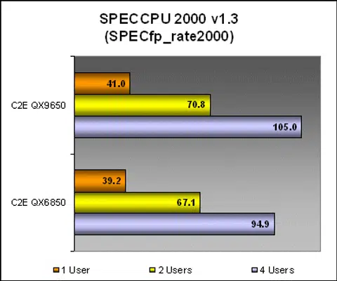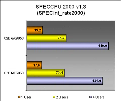 Results from the multi-threaded rate tests were more or less expected as well after what we've seen. The new QX9650 was able to maintain a pretty consistent advantage over the QX6850 be it with a single or multi user. The four user results again showed a healthy lead in favor of the QX9650. Remember, both processors run at the same speed with the same FSB. The only difference here is the larger L2 cache and cache algorithm improvements on the Yorkfield.