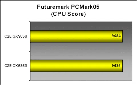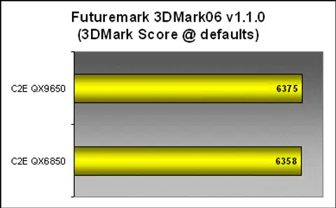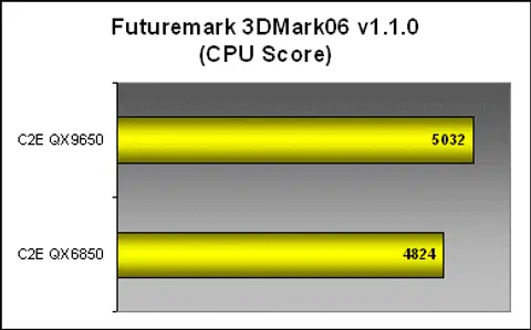 The QX9650 managed to wring around 5% boost in performance in 3DMark06's CPU rendering tests. However, when you look at the whole picture, it wasn't enough to actually make any visible difference in the overall performance numbers.