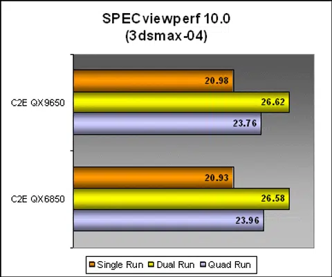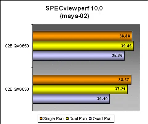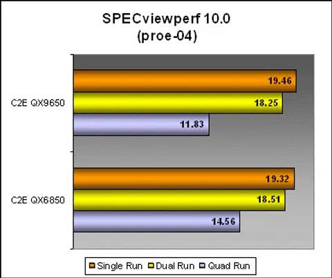 SPECviewperf 10.0 is the latest version of this industry performance benchmark that we decided to move on to. One of its features now include multi-threaded benchmarking as well. However, SPECviewperf does its threaded tests in a different way. Instead of enabling latent multi-threading within one benchmark instance, SPECviewperf actually runs two or four seperate instances of the benchmark to flood each processor/core that you have. Because of this, if you look at the scores below, performance actually drops in the quad runs. This is because we only have one GPU running four copies of professional OpenGL tests and not an indication of processor performance.