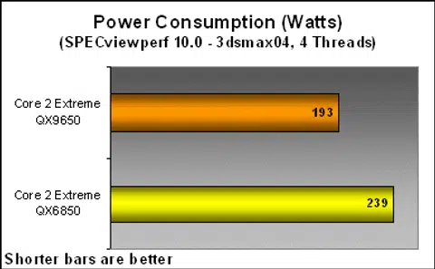 While running the power load tests above, we noticed that 3DMark06 wasn't really taxing the system, or the processors fully, even though it is supposed to be multi-threaded. In order to make sure that all four cores are constantly loaded near maximum (~90% load), we ran the quad threaded 3dsmax scenario for SPECviewperf 10.0 and took our readings. Amazingly, the QX9650 still maintained a sub 200W power draw even in this case, while the QX6850 was pushing 240W. Although the QX9650 shares the same TDP rating as its predecessors, it is very clear that Intel's new process technology has incredible power saving potential.