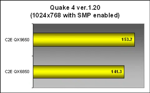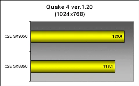Moving from synthetic gaming benchmarks to actual games, the QX9650 continues to prove that the Penryn isn't just a die-shrunk Conroe. Like AquaMark3, Quake 4 actually showed visible and tangible performance gains in both single and multi-threaded modes. In this particular game, we actually saw very impressive performance gains of more than 10fps, a gap that was previously seen between a mainstream Q6600 and the Extreme QX6850 (that's a 600MHz core frequency gap if you're taking score). Here, the QX9650 seemed to work wonders.