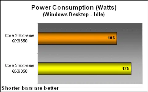 Plugging a power meter to the main socket, we measure the power draw of the whole system based on the scenarios below. All processor power saving features are enabled through the motherboard BIOS for this test, and we reuse the same system setup as our benchmarking test bed. Idling in Windows, the QX9650 draws in 106W of power, while the older QX6850 pulls nearly 20W more.
