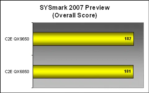 With all the new architecture enhancements and threaded optimized features of new processors, we've decided to phase is some of the newest benchmark updates as well. Retiring SYSmark 2004, we benchmark the QX9650 using the latest SYSmark 2007 Preview. However, the results here weren't as generous as SPECCPU 2000, although they are telling on its own as well.