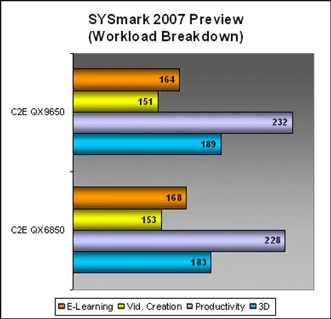 The overall results show that the QX9650 and QX6850 are both equally matched, which seems to indicate that the benchmark isn't optimized for SSE4. If you look at the breakdown scores, the Video Creation test shows no improvement over the QX6850. There was also no real gain (and even a minute loss) in the E-Learning workloads. The QX9650 did however, manage to gain a lead in both Productivity and 3D segments of the benchmark, once again thanks to its larger L2 cache and overall architecture improvements rather than specific technology support.