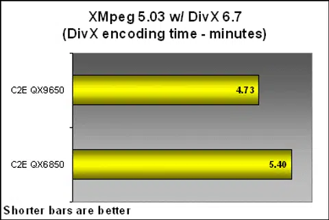 Running our DVD compression test using the latest SSE4 enabled DivX CODECs, the QX9650 completed our test a whole 40 seconds faster than the QX6850, bringing conversion time down to a mere 4min and 44sec for a 1GB DVD sample file. Considering both processors are of the same class and speeds, this is an impressive achievement indeed.