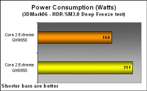 3DMark06 proved to be an easy and effective method to test both CPU intensive loading as well as a more well rounded gaming scenario through its CPU Test and HDR/SM3.0 Deep Freeze Test respectively. In the CPU tests, the QX9650 drew a peak of 170W, while the QX6850 broke the 200W barrier with a max draw of 216W. The gaming tests were no different as well. The QX9650 was running cool at only 164W, while the QX6850 was still pretty much heating up at 211W. The power draw difference reached more than 45W here!