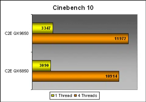 Media performance is an area that the Core microarchitecture has shown great improvement in the past and the new SSE4 is supposed to give the QX9650 a much bigger boost. In these two benchmarks, we have two industry standard tools in imaging and video compression. Cinebench 10, which is not SSE4 optimized and DivX 6.7, which is.