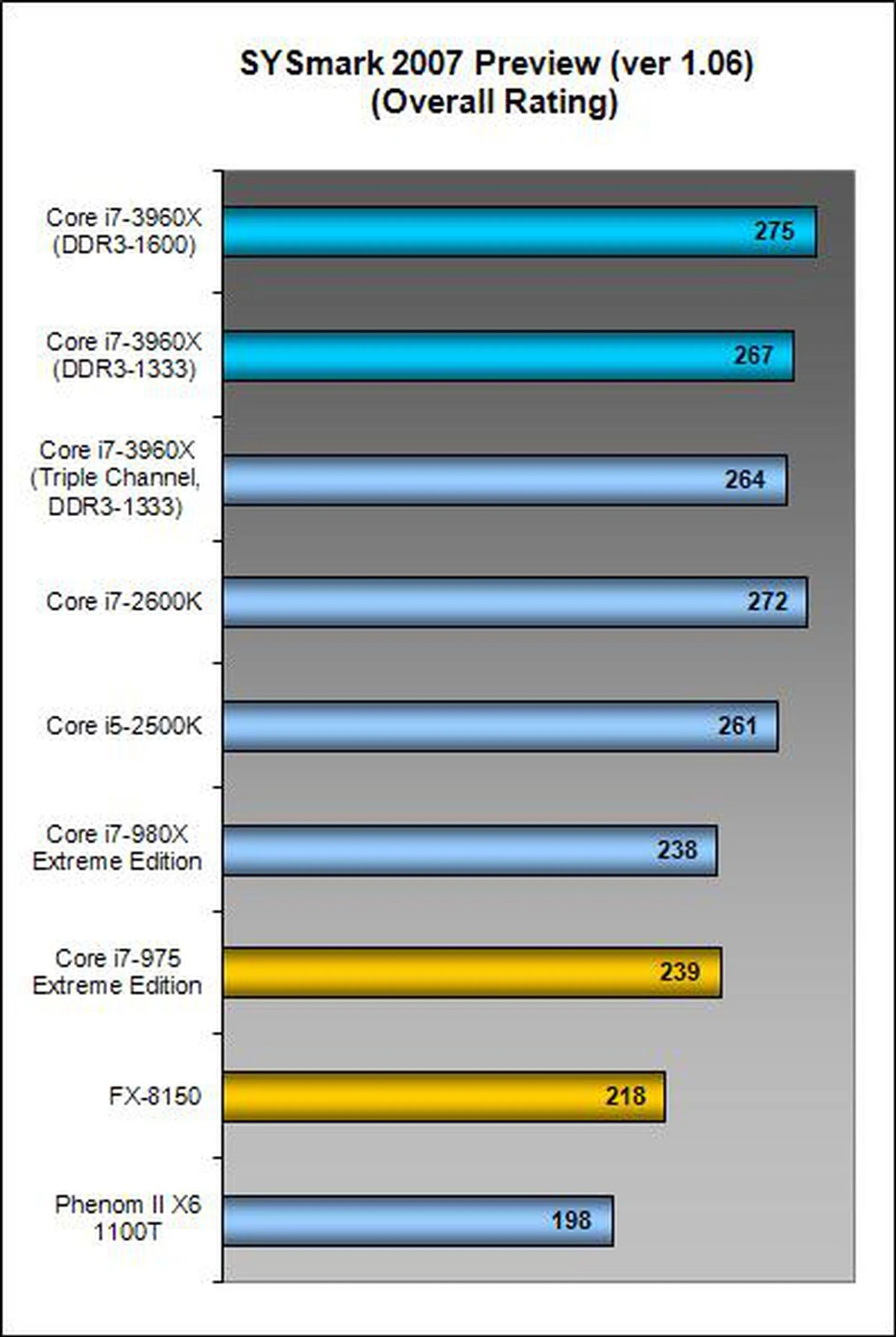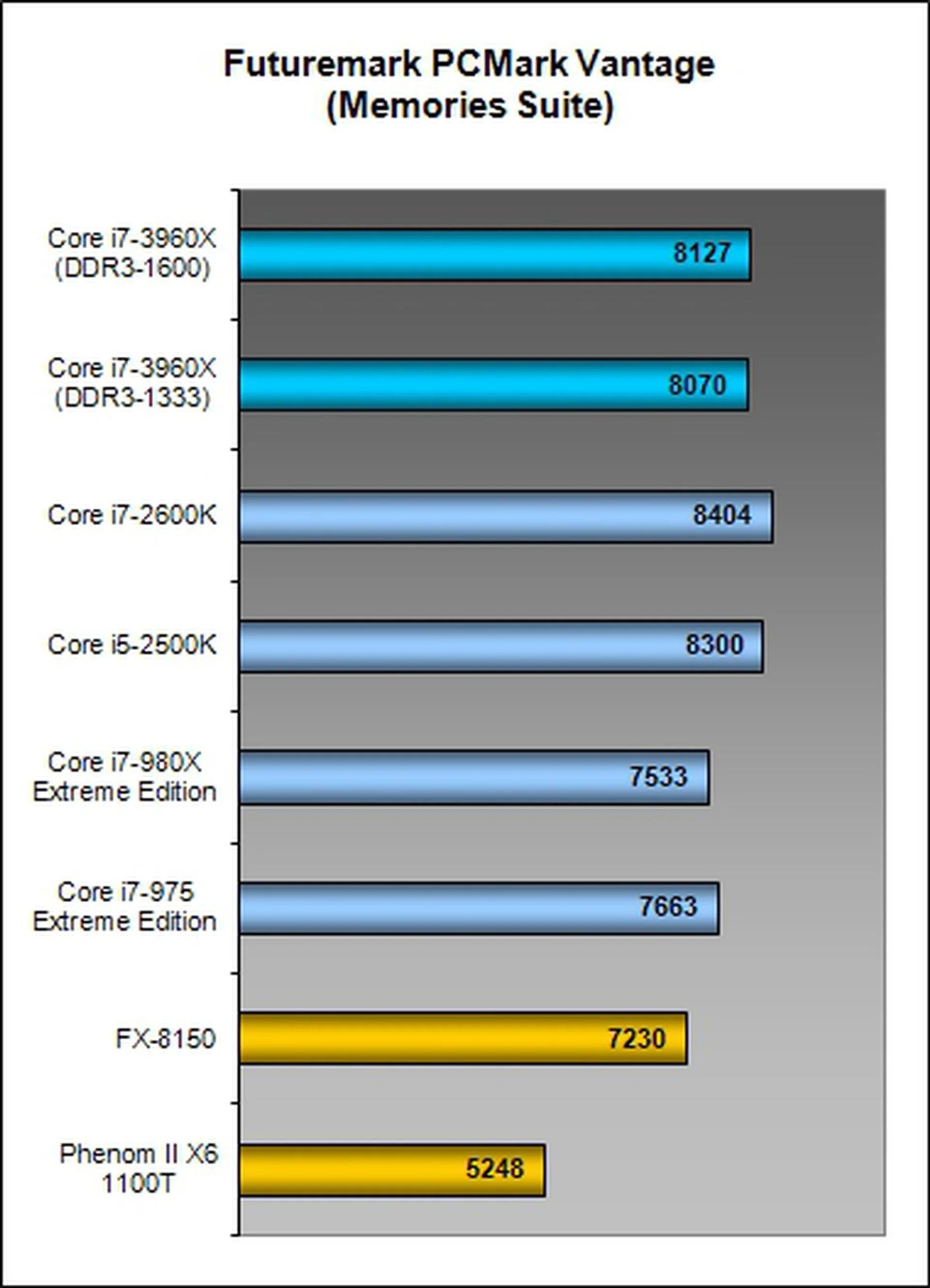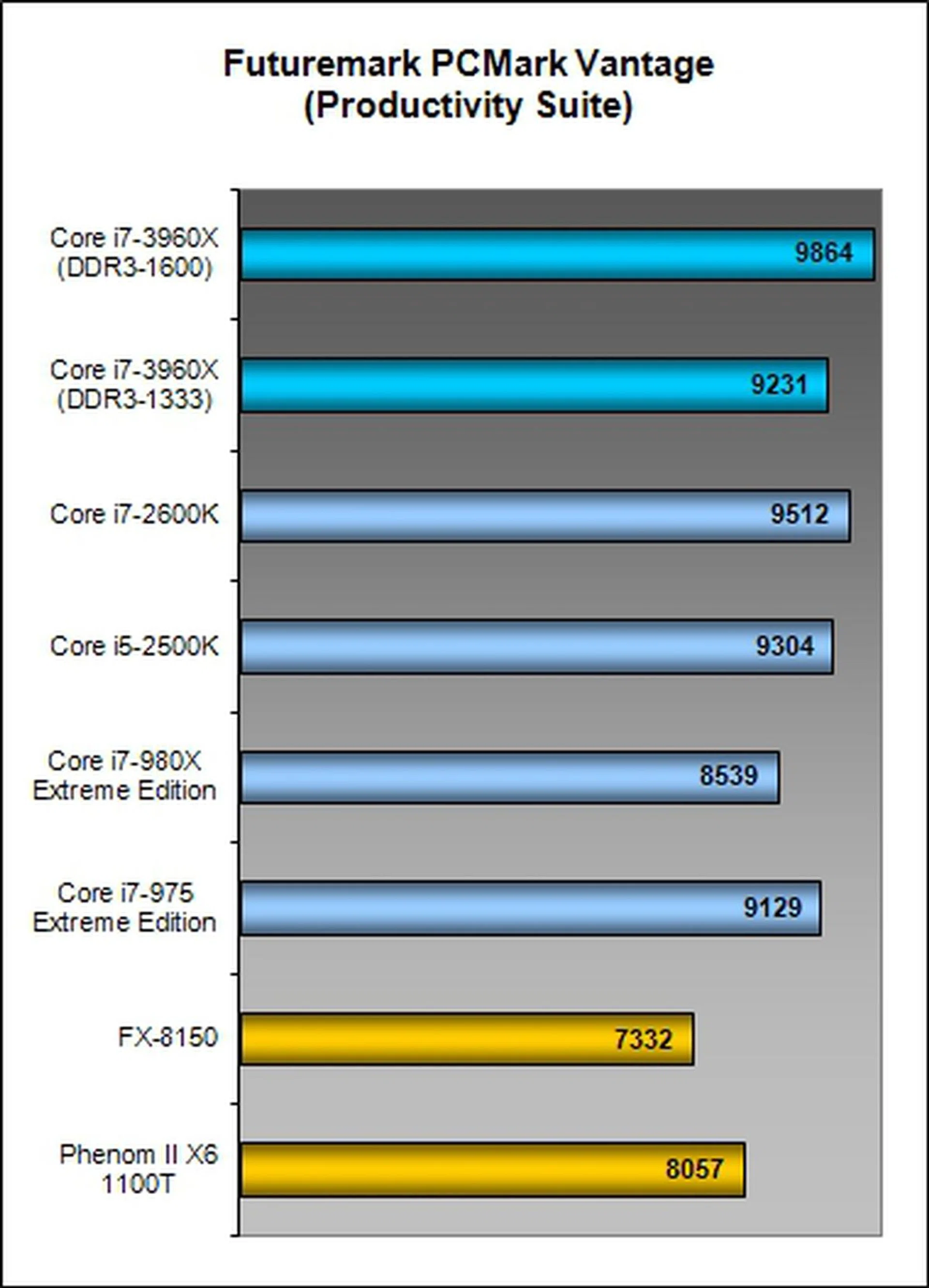 Speaking of results, the new kid on the block was hardly any faster than the compared processors and platforms in this test. For some technical reason, the AMD FX-8150 platform failed to produce results. The Core i7-3960X outperform AMD's Phenom II X6 1100T by almost 39% in terms of overall rating. By utilizing memory modules of higher clock frequencies, we eked out a slight increase (approximately 3%) in overall performance - pretty much within our usual expectations. While that might not have seemed like much at all, we peered at the detailed set of results and noticed that the video creation test suite recorded a much more notable 7% increase in performance when using DDR3-1600 over DDR3-1333. So while general users may not see any benefits to splurge on more expensive memory, certain usage scenarios and workloads will pay off. You just need to identify what you spend time most on the PC and justify if the extra spent on the memory is worth your while.
